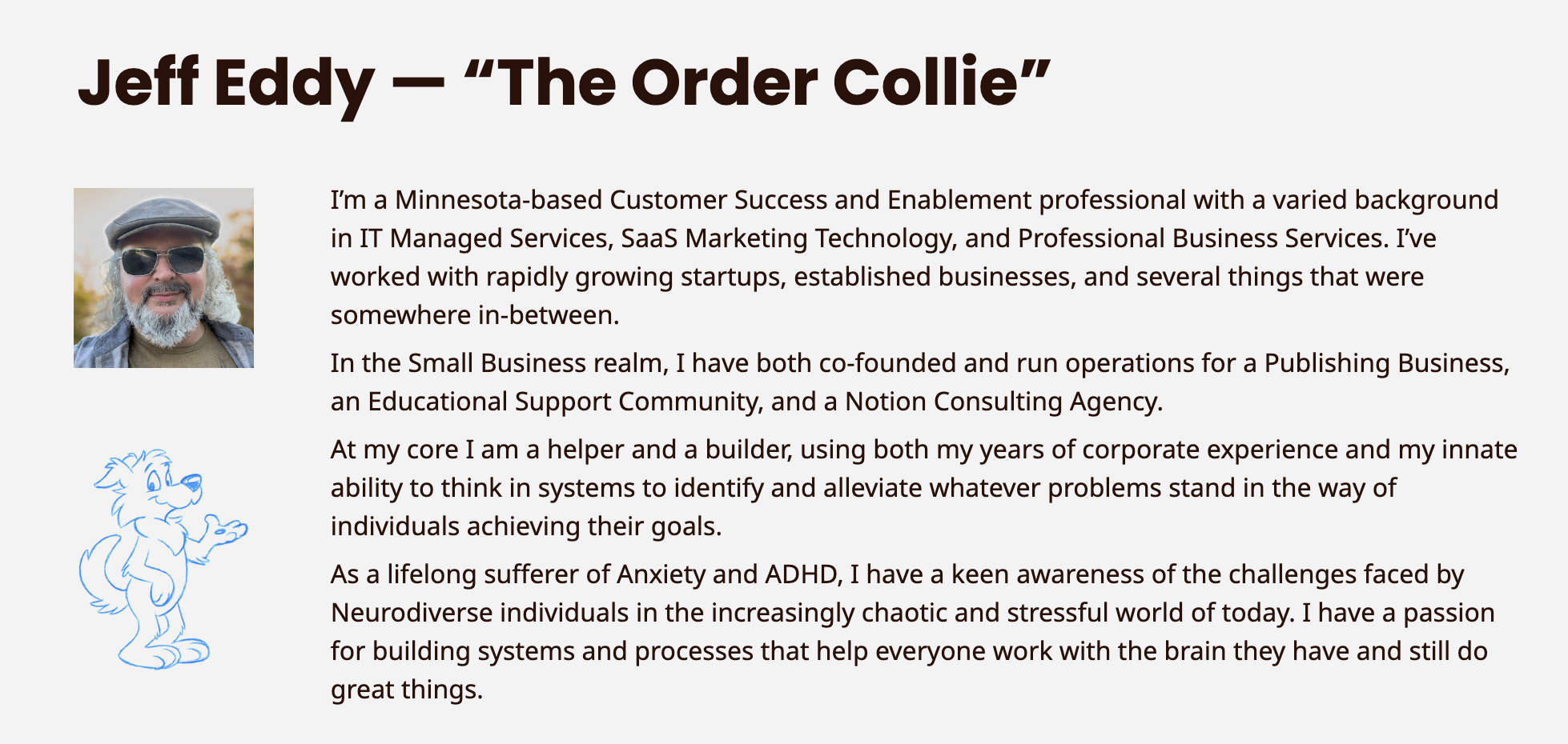 Jeff is the bearded half of Paws2Trail. In addition to being a Notion Ambassador and super-user, he helps businesses, corporate escapees, and solopreneurs sort out pain points, streamline their operations, and develop long-term strategies. He's especially keyed into the challenges of work (and life) with ADHD and other forms of neurodivergence.