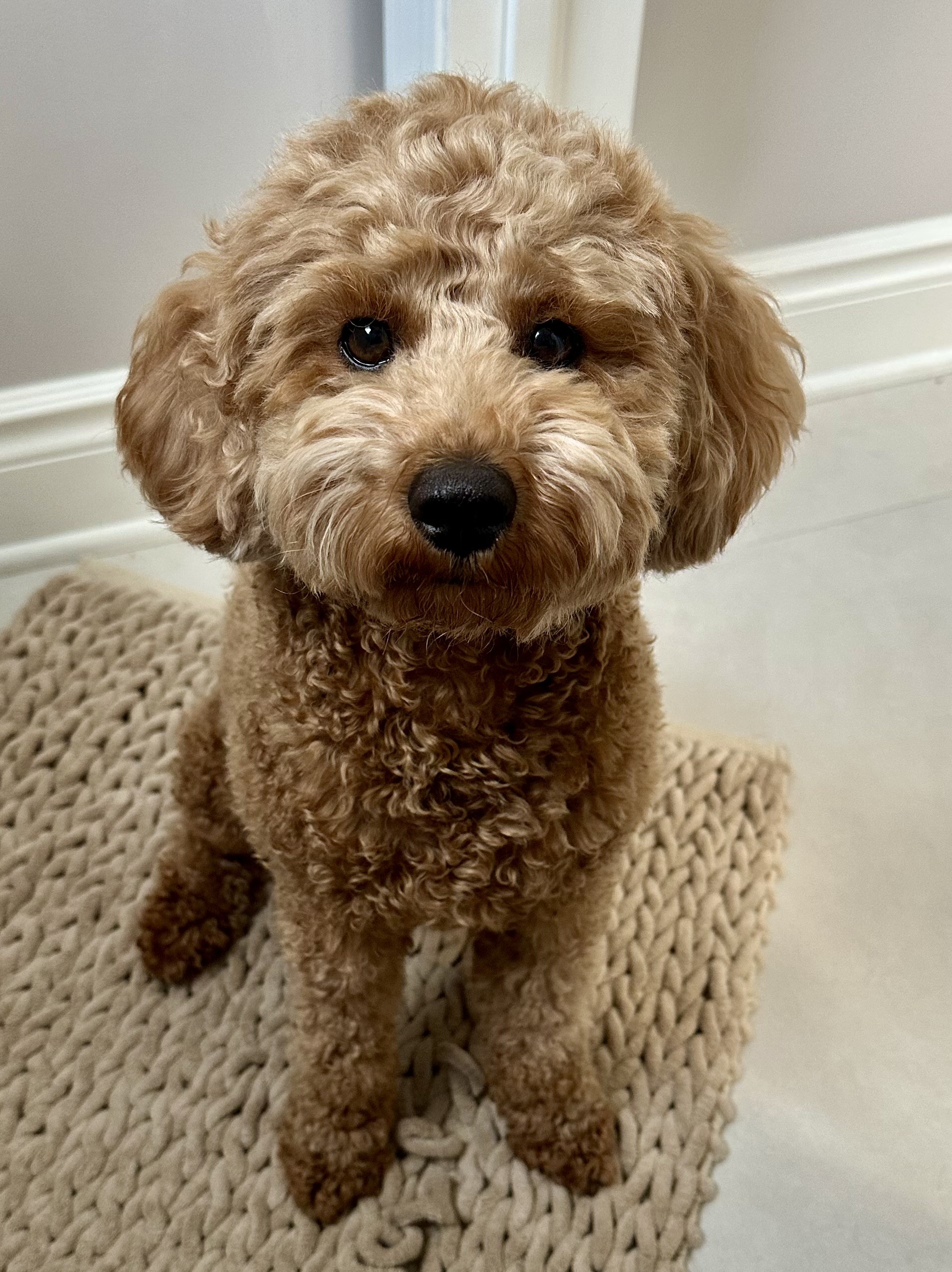 I’ve taught the dog to ring a bell if she has to go outside. When she comes back in she gets a treat for ringing the bell. She now rings it, stands on the deck for a few minutes then comes back in and demands her treat. Don’t tell me animals are dumb. Especially poodle mixes. Here’s a picture of her guarding me while I use the facilities.