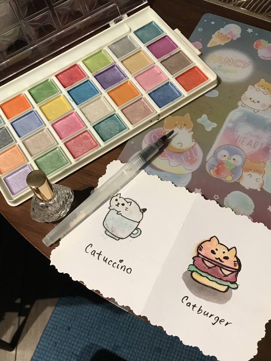 Hand sketched a catburger and catuccino with a pen; painted both with water brush and colours #CreativePlay #watercolour #kawaii #illustration #handdrawn #CatsOfCrissy #puns
