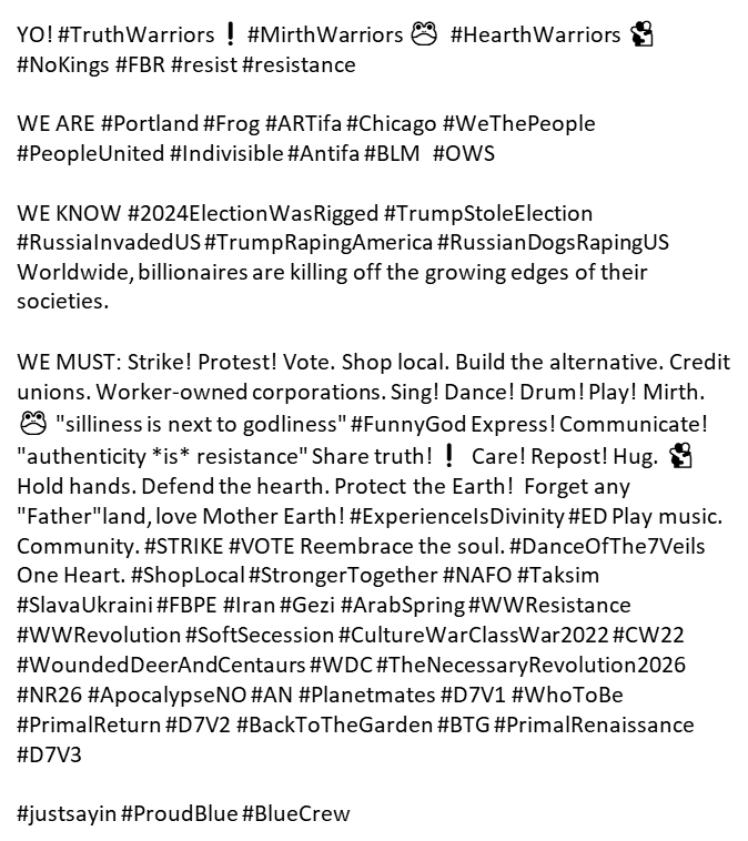 🧵🧵YO! #TruthWarriors #MirthWarriors #NoKings #FBR #resist #resistance WE #Portland #Frog #Chicago #WeThePeople #PeopleUnited #Indivisible KNOW #2024ElectionWasRigged #TrumpStoleElection WE MUST: Strike! Protest! Vote #STRIKE #VOTE #StrongerTogether #WWResistance 🧵 #justsayin #ProudBlue #BlueCrew