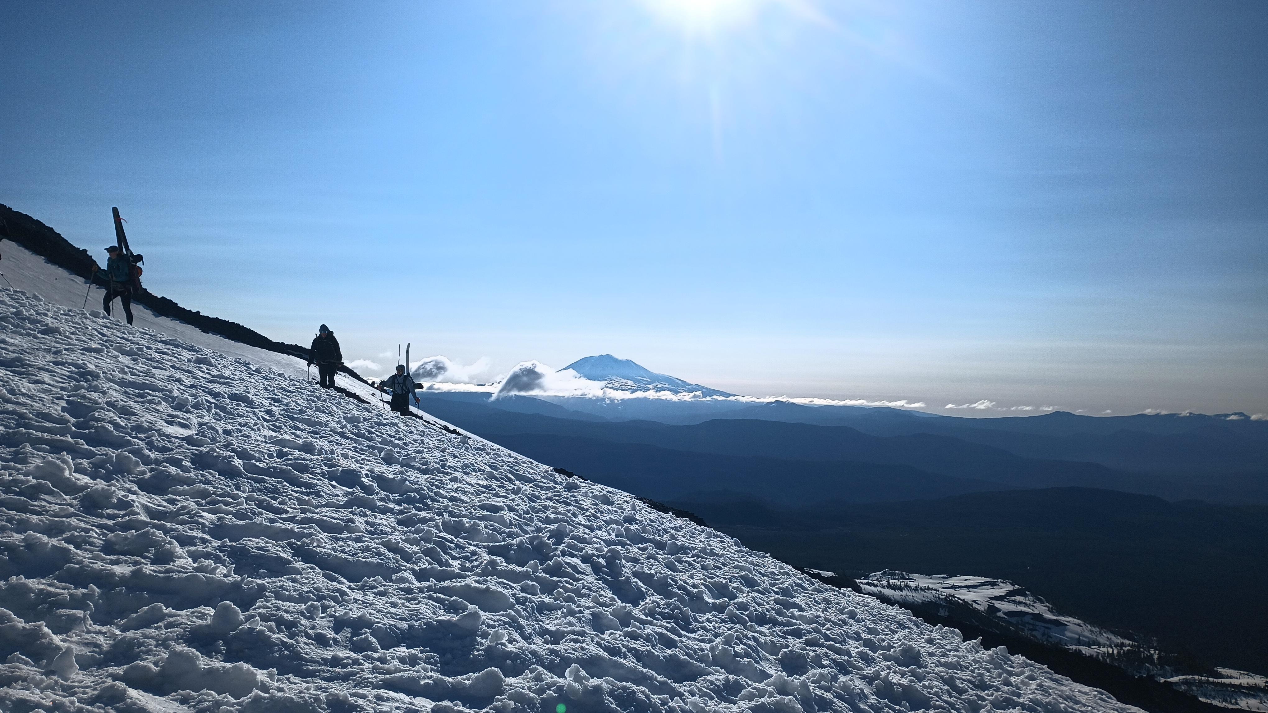 Looking across a snowy mountain slope, with three climbers, at mount adams in the distance, under a shining crystal sky.