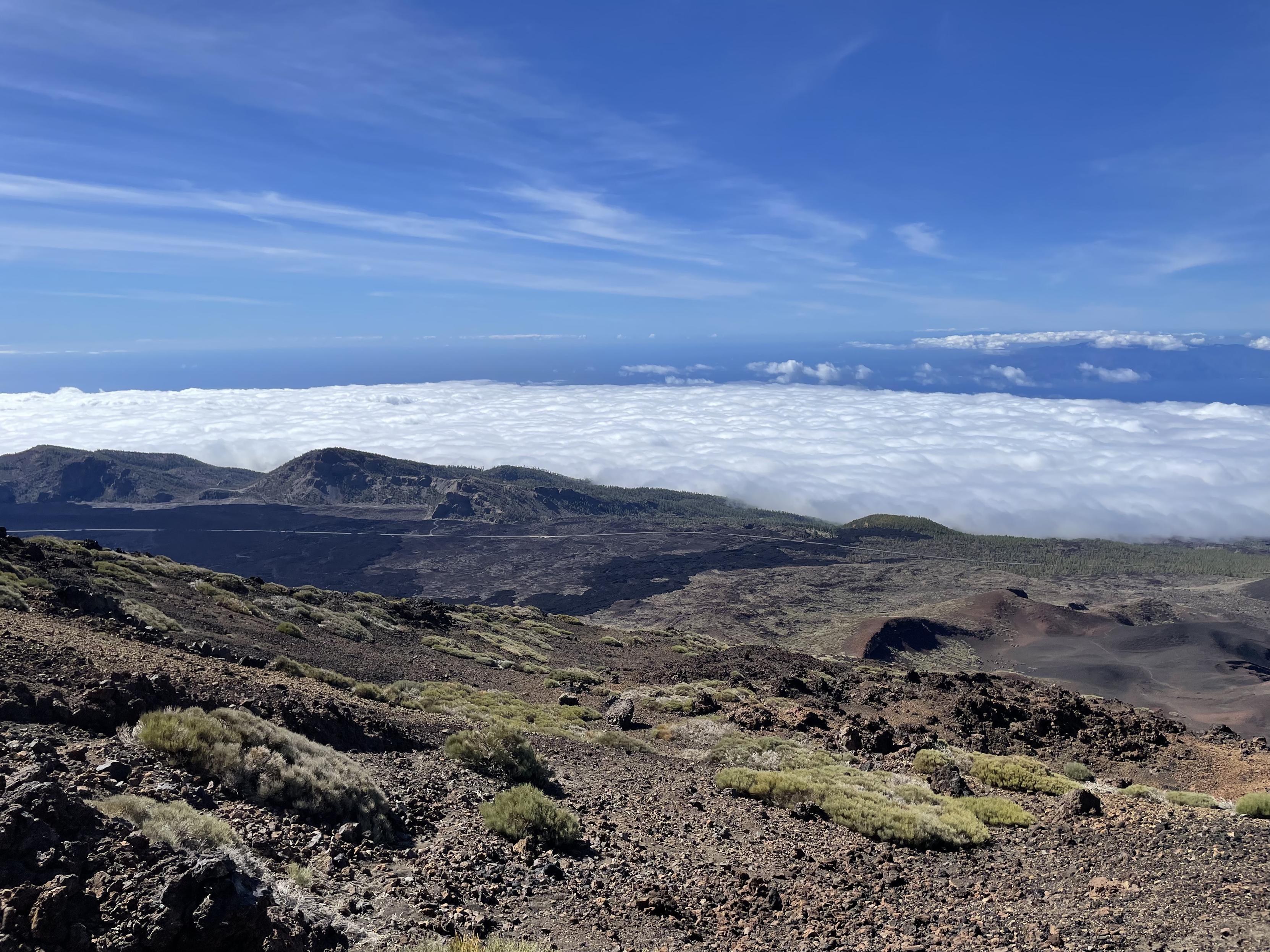 A wide, outdoor shot depicts a landscape under a clear, blue sky. The foreground consists of dark, rocky terrain covered with sparse patches of low-growing vegetation. Gentle hills roll into the distance, covered in similar dark rock and vegetation, creating a textured, uneven surface. A thick layer of white clouds fills the middle ground, obscuring what lies beyond the hills, and creating a horizon line. The sky is a bright, cloudless blue with some wispy cirrus clouds visible.