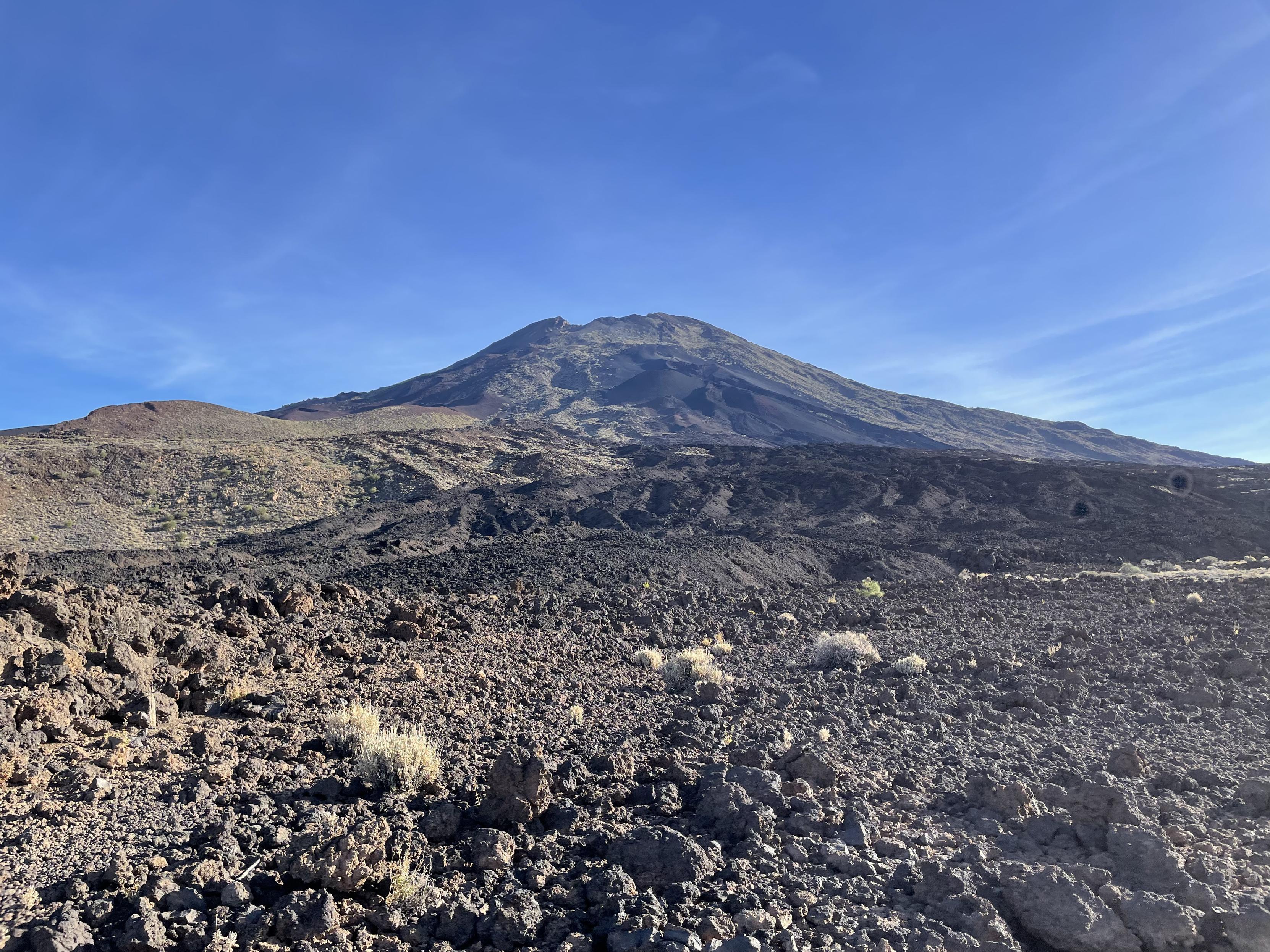 A wide-angle shot depicts a mountainous landscape under a clear, blue sky. The foreground and midground are dominated by rough, dark gray and brown rocky terrain, with scattered, small, dry vegetation. A large, conical volcano rises in the background, its slopes covered in similar rocky material. The volcano's peak appears rounded, and there are subtle variations in color and texture on its sides.