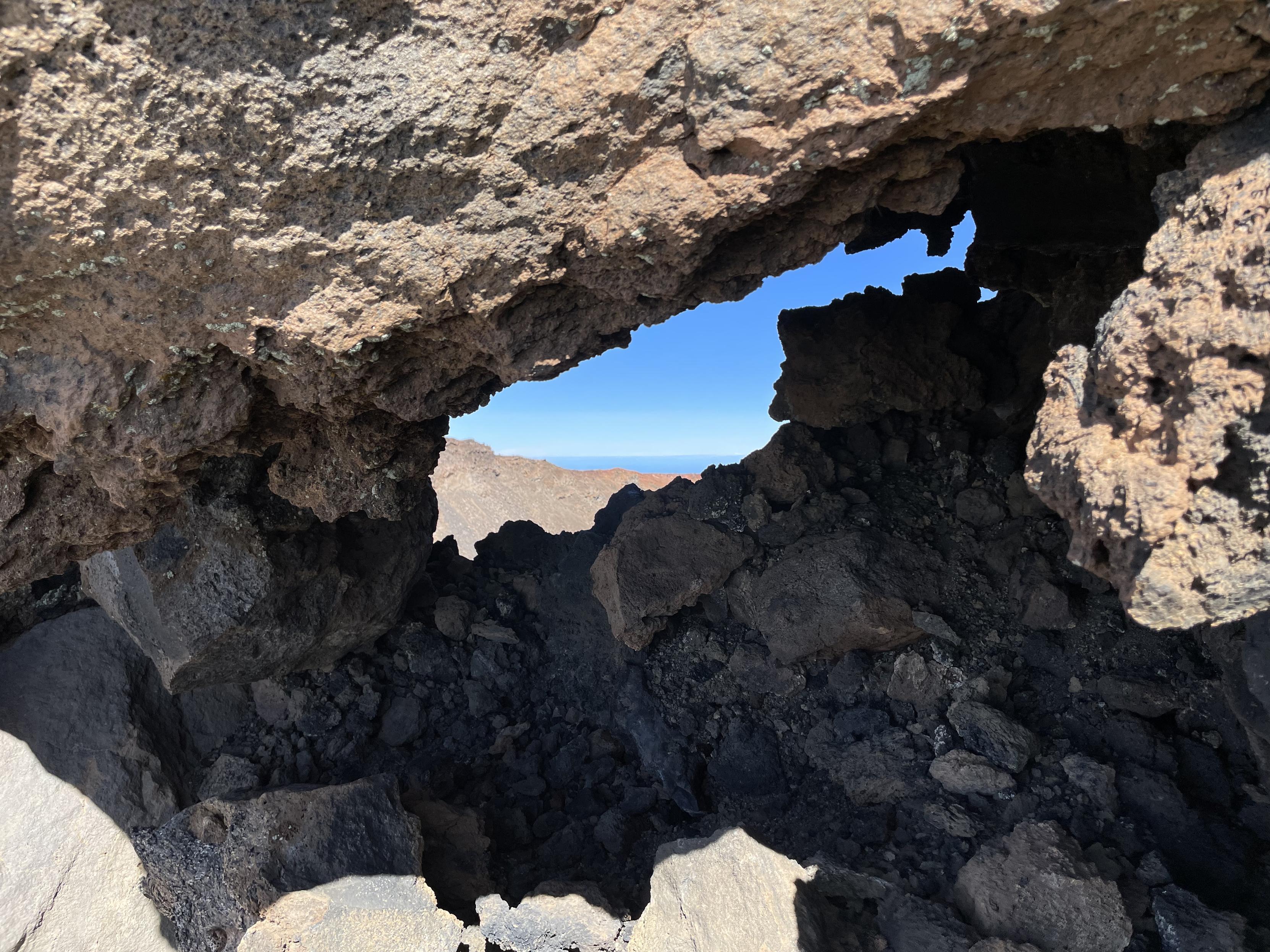 View of the summit, i.e. the crater: The image is framed by dark, jagged rocks, looking out onto a bright, sunny landscape. The foreground is dominated by a cave-like opening filled with rough, dark brown and black stones of varying sizes, creating a textured, uneven surface. The opening narrows to reveal a glimpse of a distant, pale beige, mountainous terrain with a clear blue sky above. The rocks in the foreground are clustered closely together and appear to be natural formations.