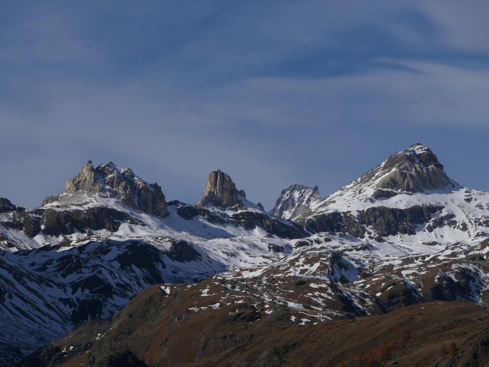 Les Cimes Blanches: Pointe Sud (2973m), Bec Carré (3003m) and Gran Sometta (3166m) as seen from the East.