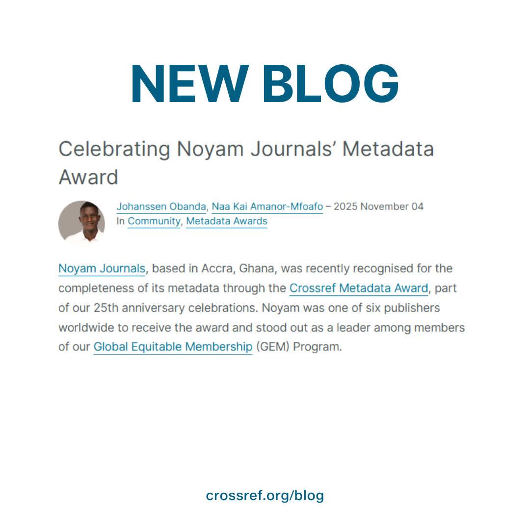 Noyam Journals in Accra, Ghana, has been recognised for the completeness of its metadata with a Crossref Metadata Award.