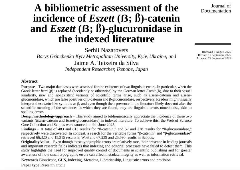 Our new bibliometric study reveals how a tiny typographic error, confusing the German Eszett (ß) with the Greek beta (β), has created hundreds of false positives like ß-catenin and ß-glucuronidase in major databases: