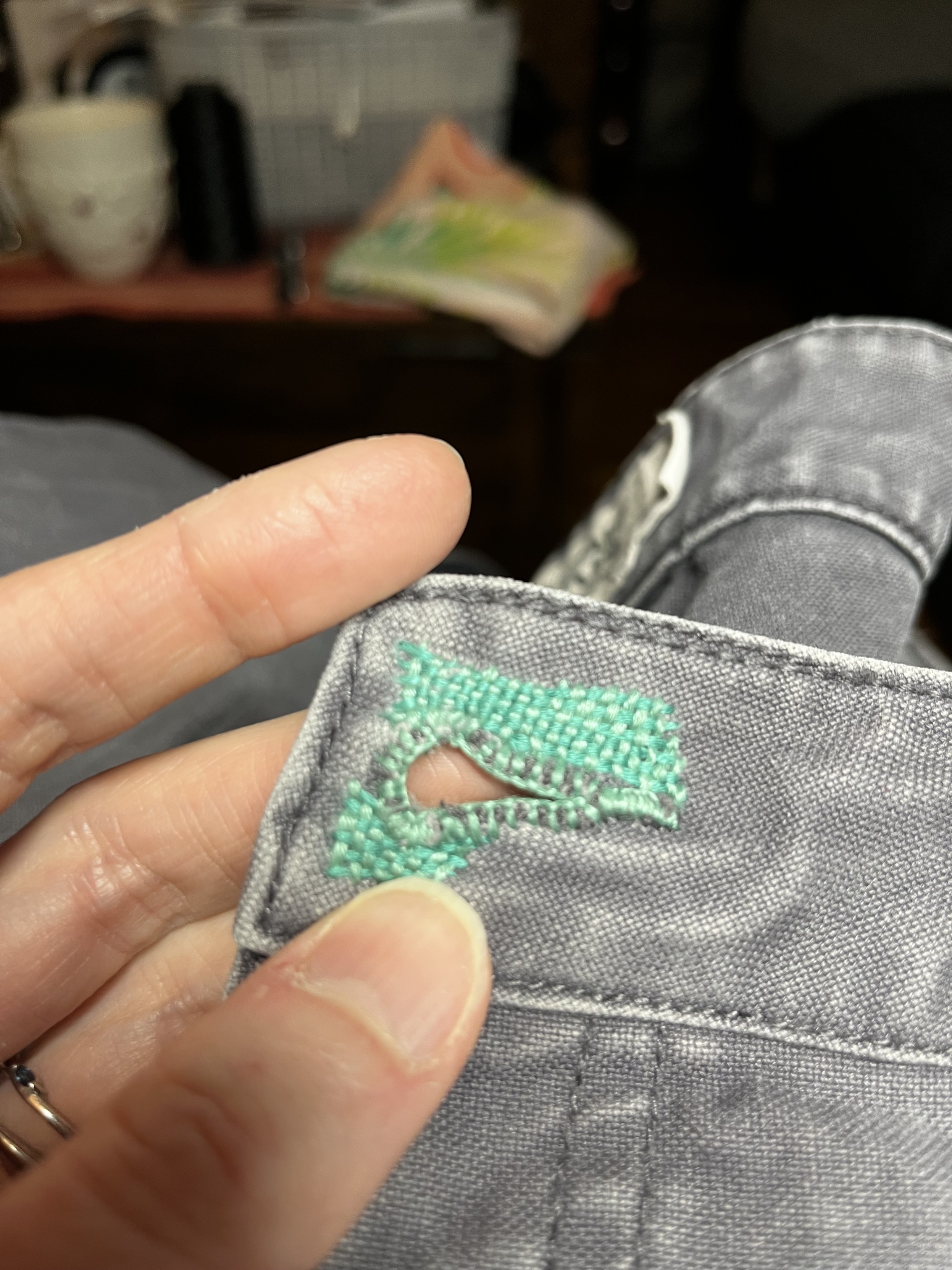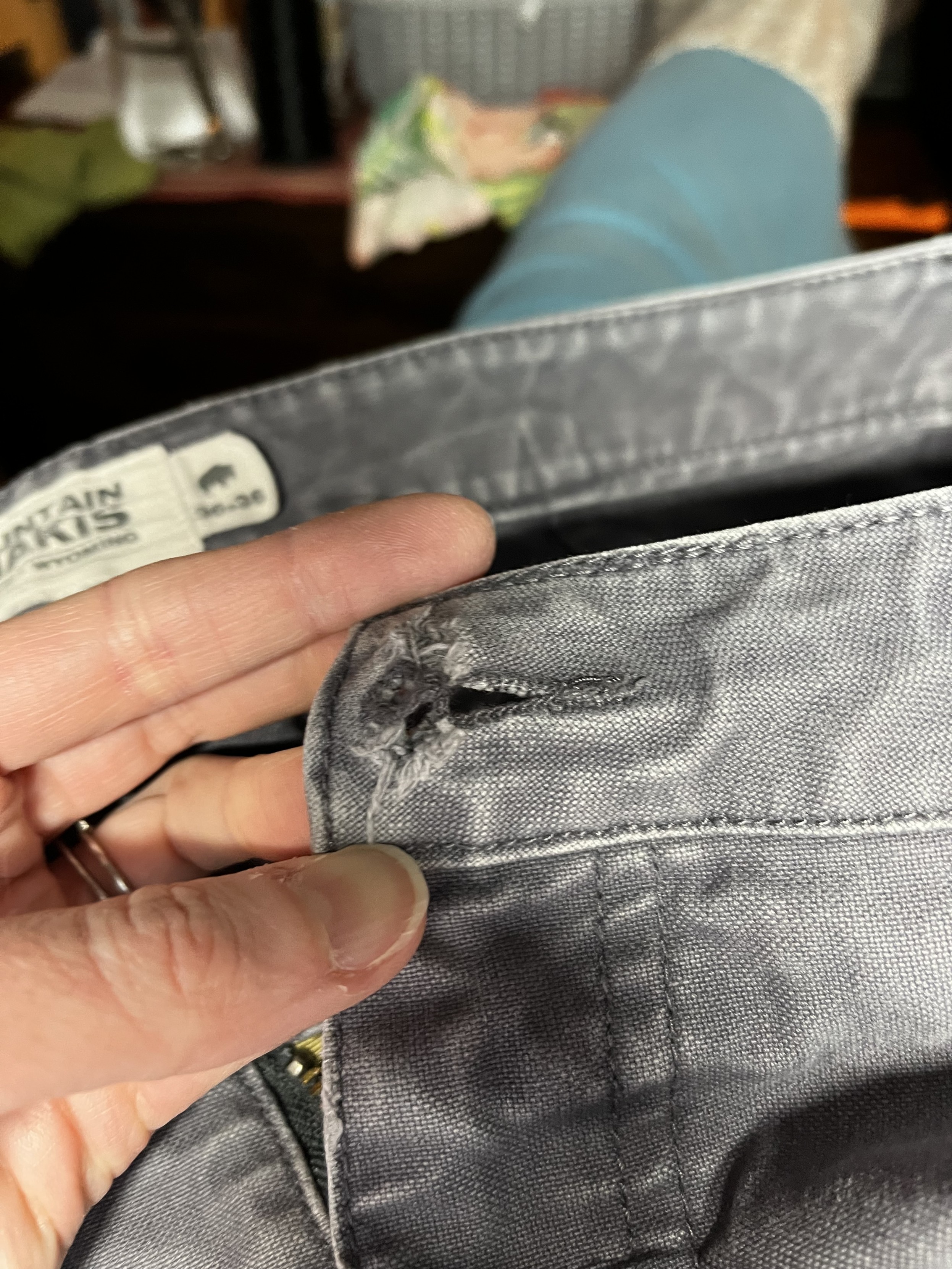 A photograph of a woman’s hand holding the waistband of a pair of grey canvas pants. The buttonhole has ripped vertically and is all frayed.