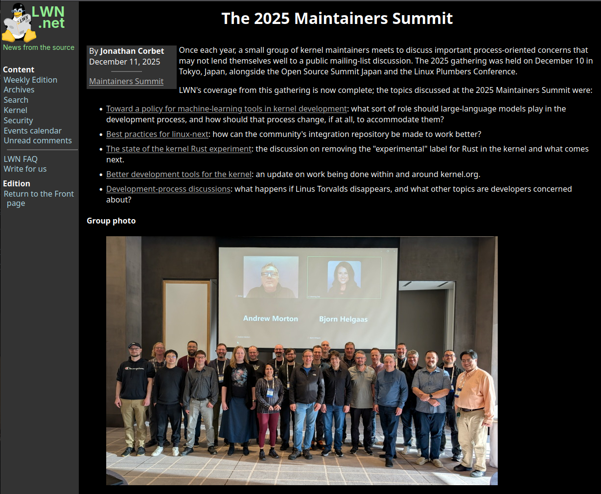 * Toward a policy for machine-learning tools in kernel development – https://lwn.net/Articles/1049830/