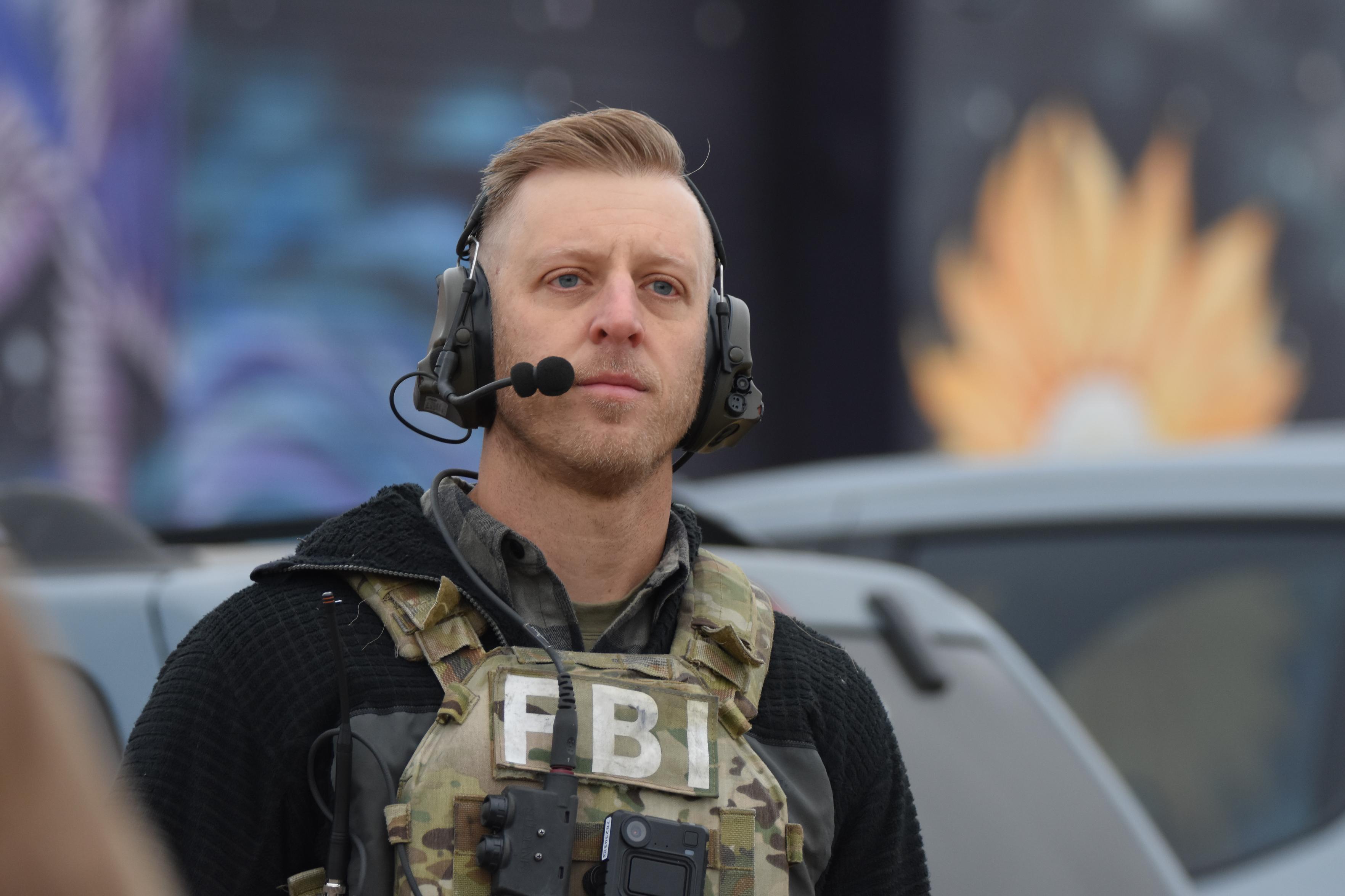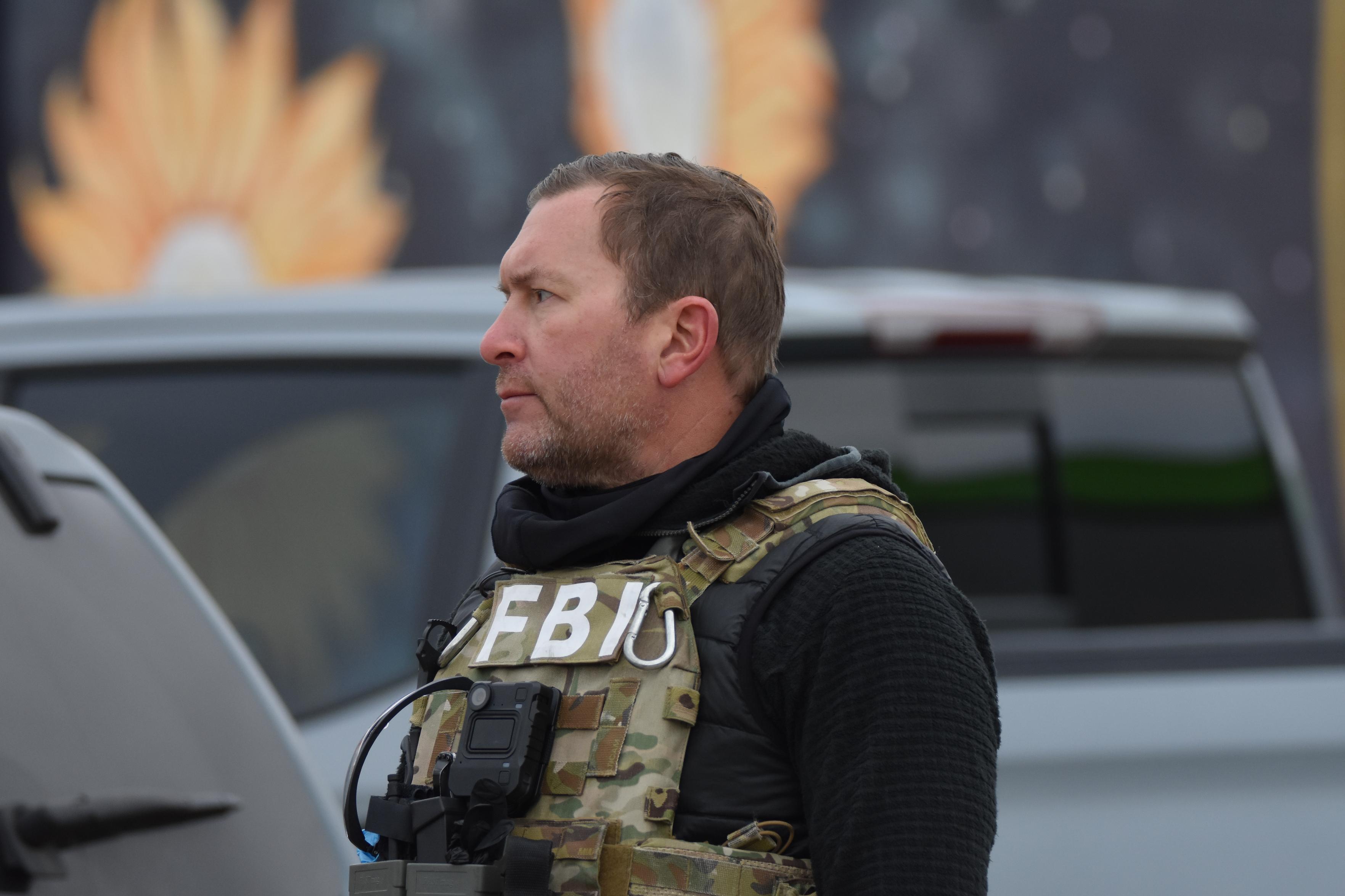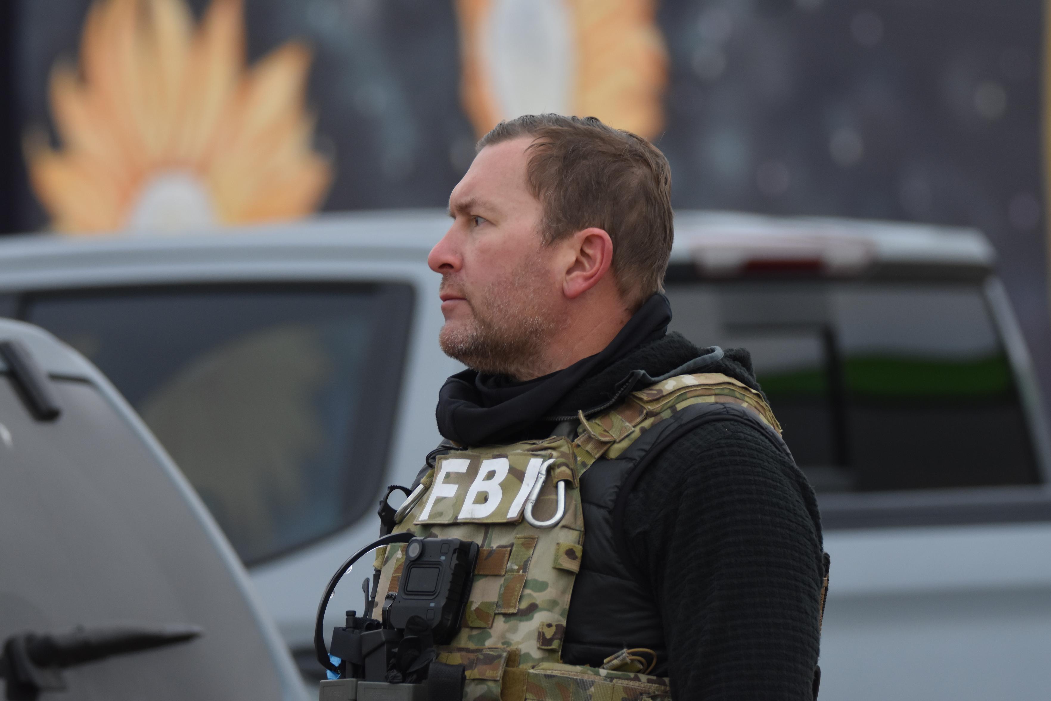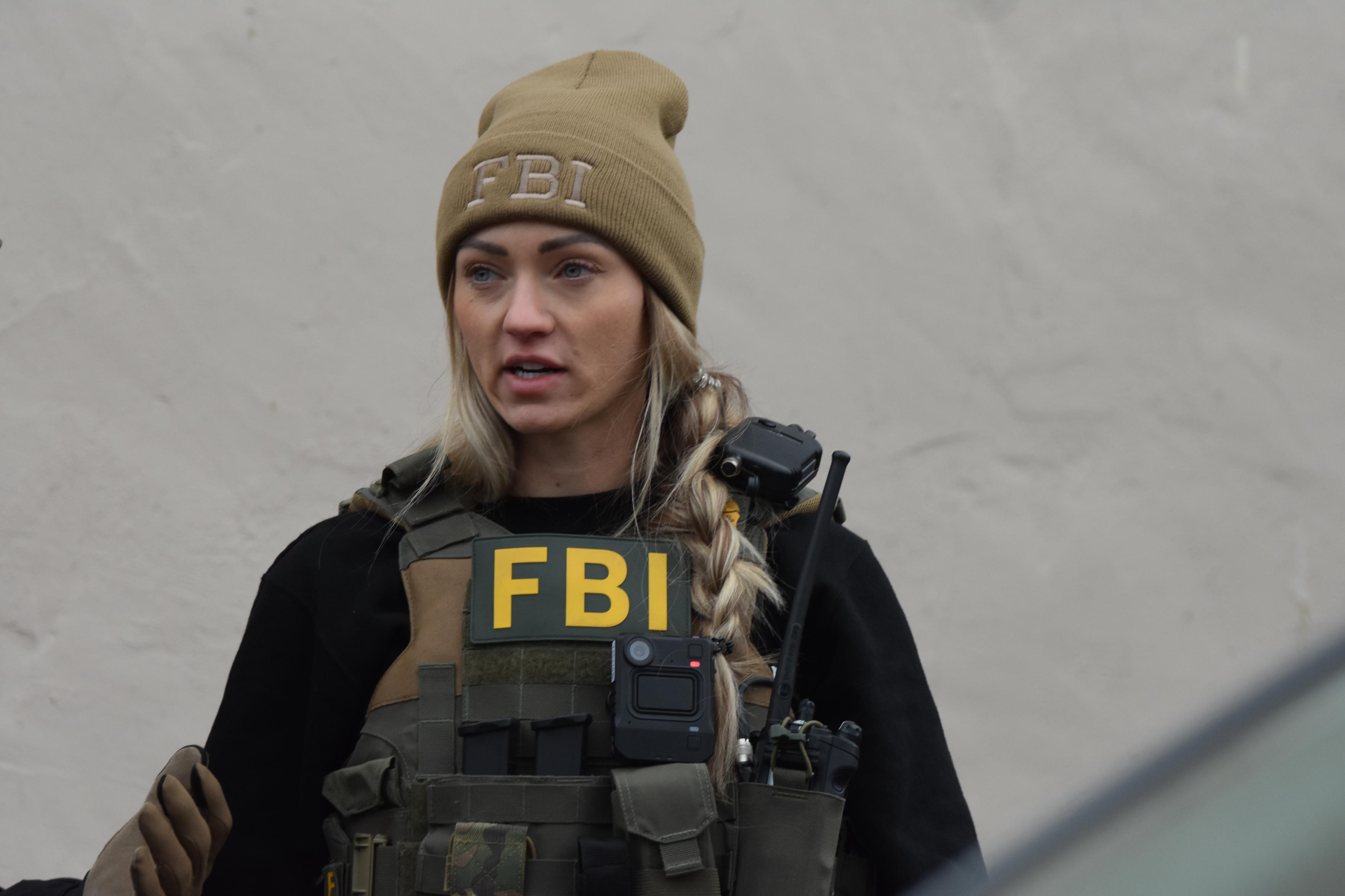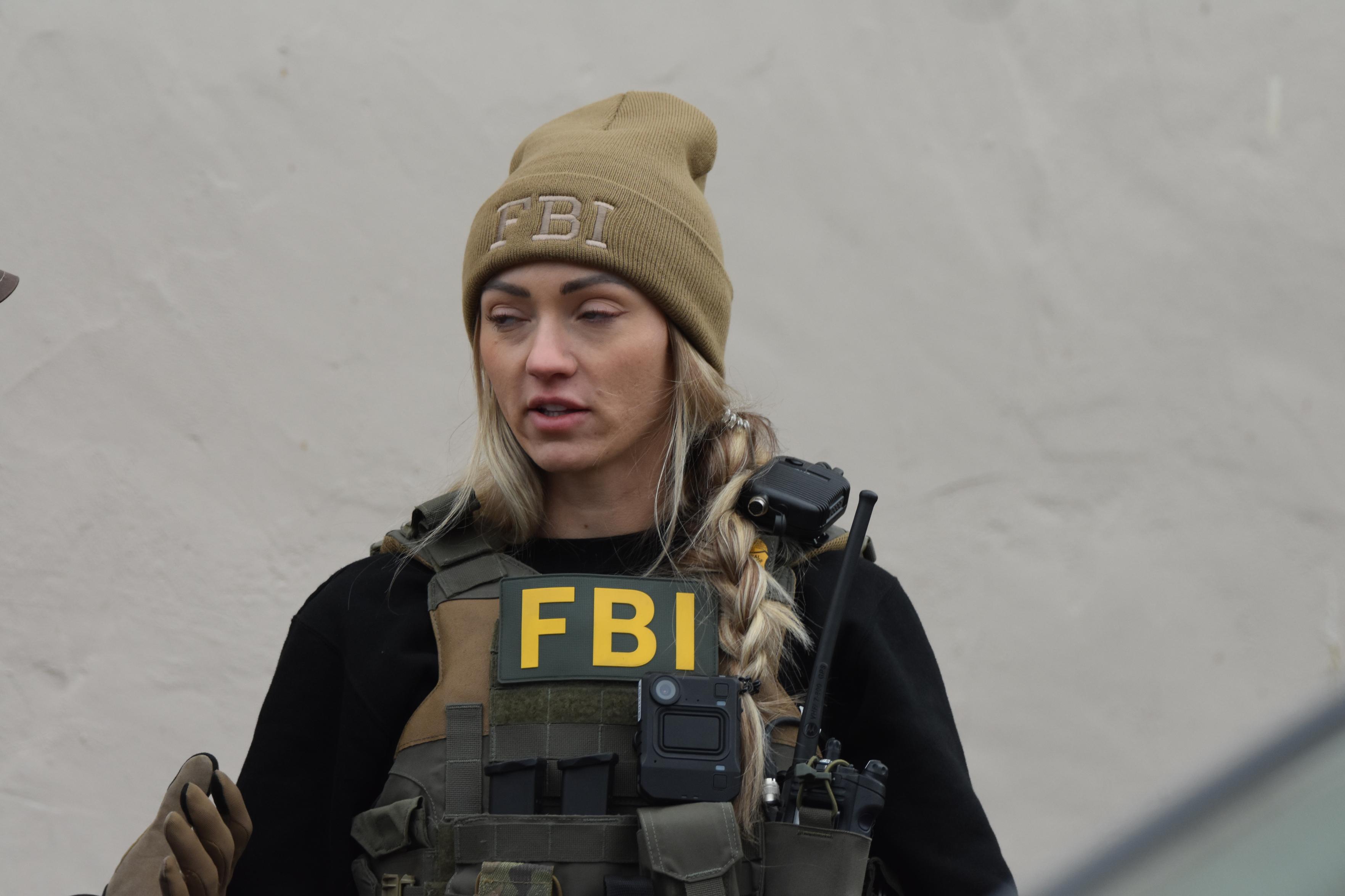 Female Federal agent (with long blonde hair and brown knitted cap reading FBI and vest reading FBI) at today's immigration action at Bro-Tex in St Paul.