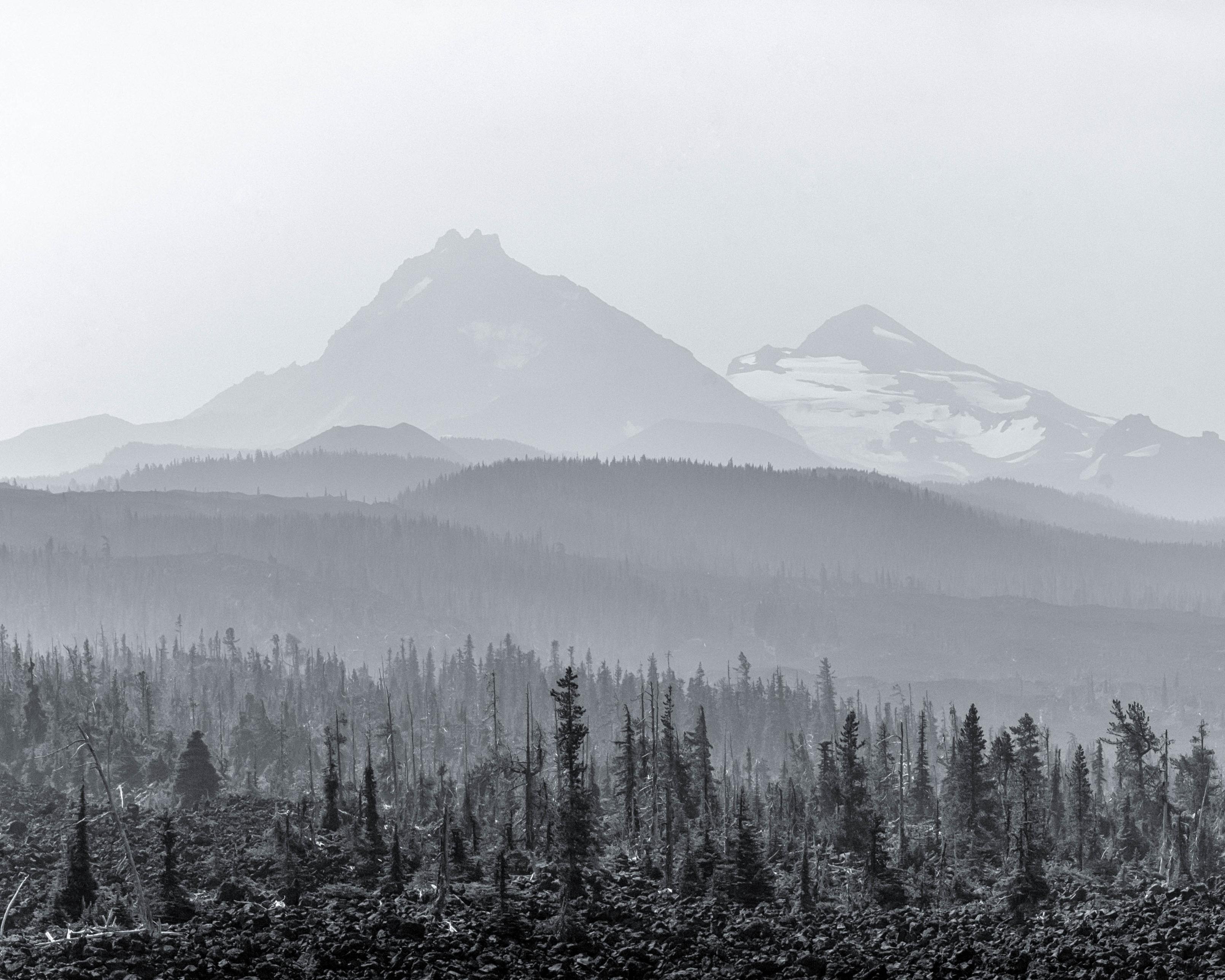 The Central Oregon Cascades disappear into summer haze, photographed from the Dee Wright Observatory.