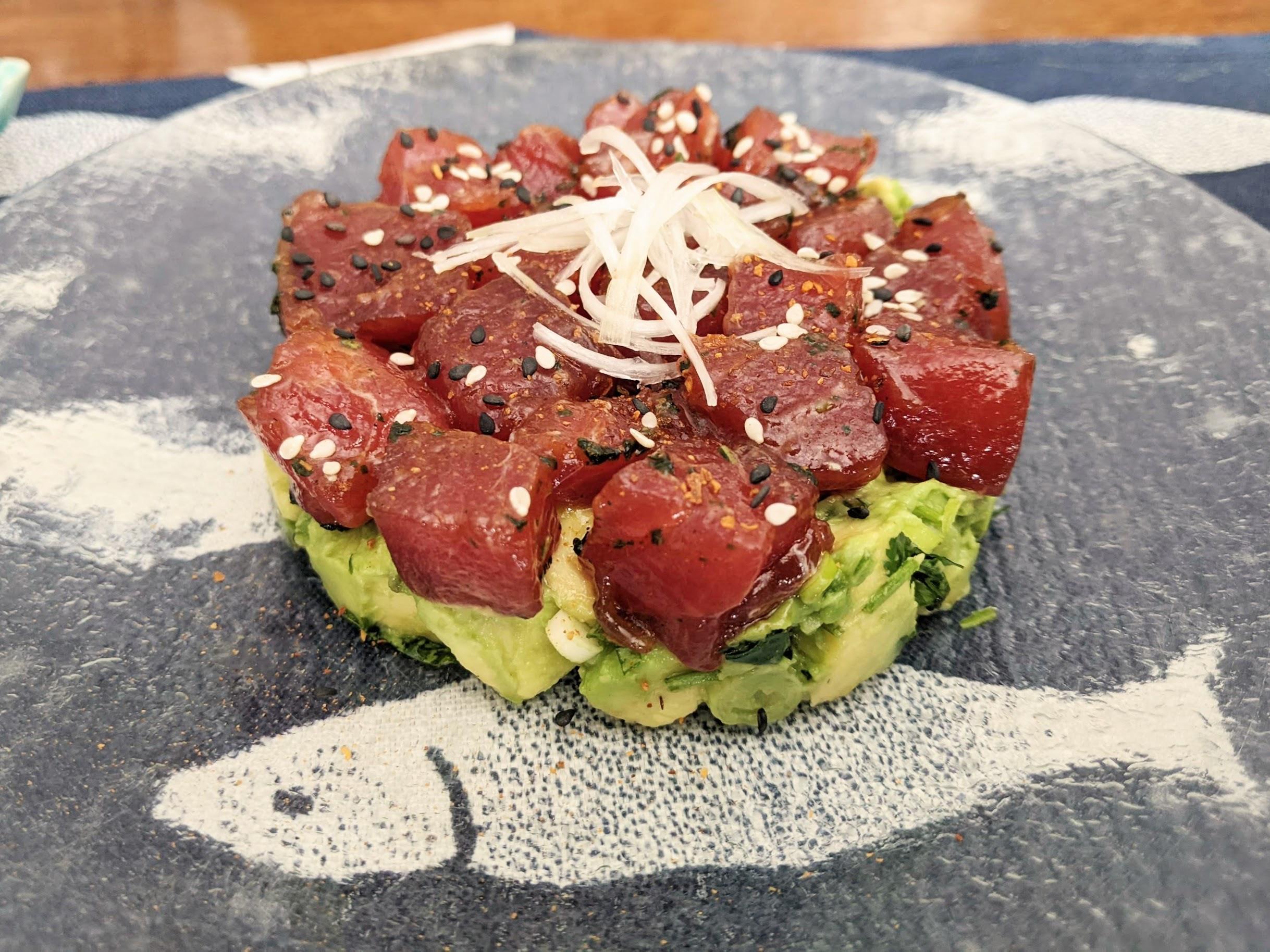 Avocado had a minced half jalapeño and chopped scallions, cilantro, and tuna was mixed a touch of soy, chili oil, mirin, wasabi and dried green shiso - black white sesame seeds and scallion whites garnish