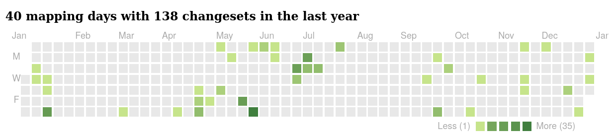 In 2025 I had 40 mapping days with 138 changesets to OpenStreetMap. That's the fewest contributions I've had since 2018, and 78 fewer days than in 2024.