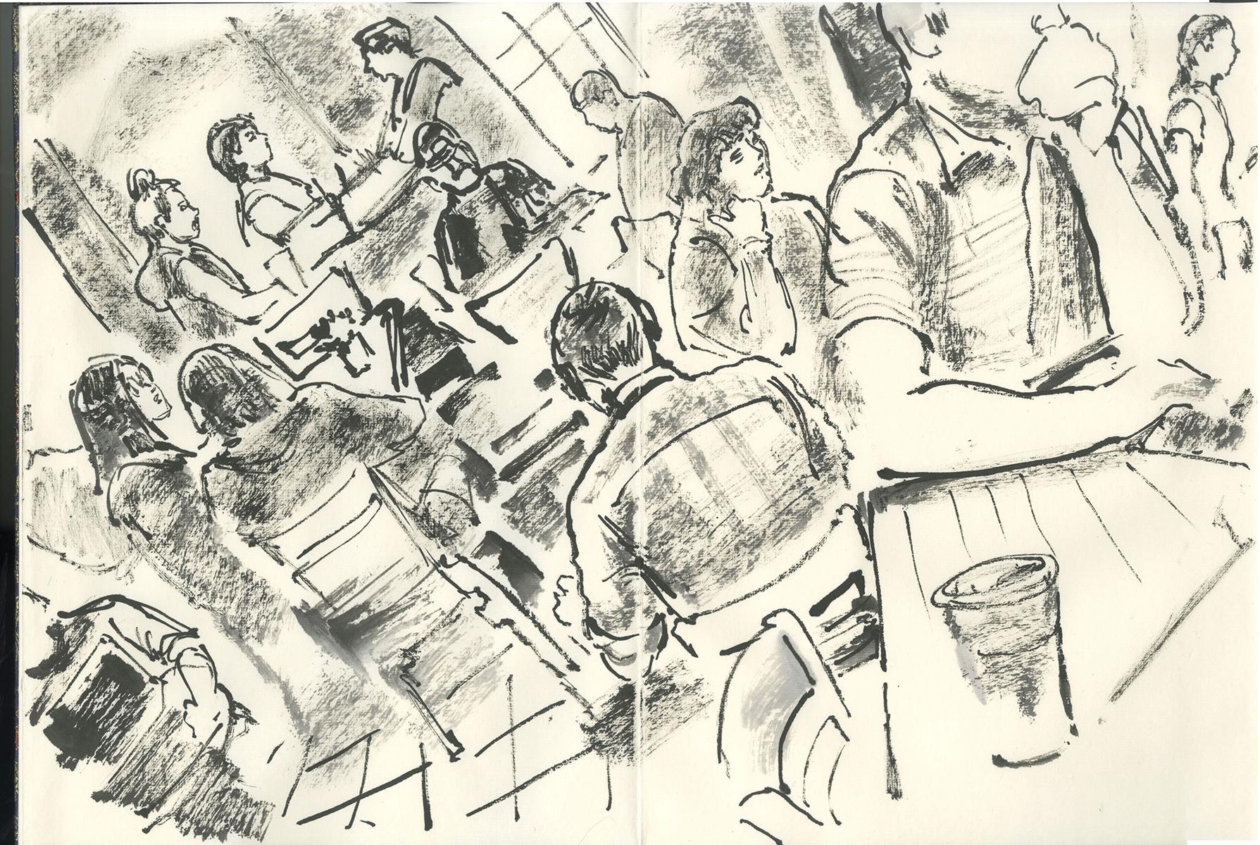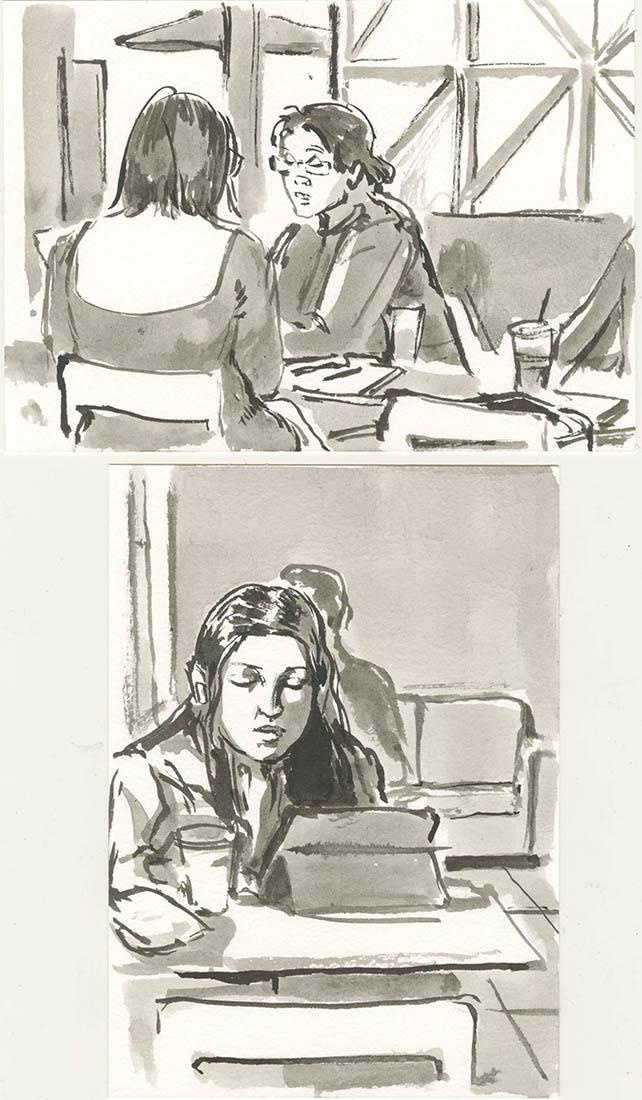 Here's #urbansketching from this morning at mega-coffee corp. It isn't the crowds of the other place, but not bad for drawing people today, at least. The window light adds something.