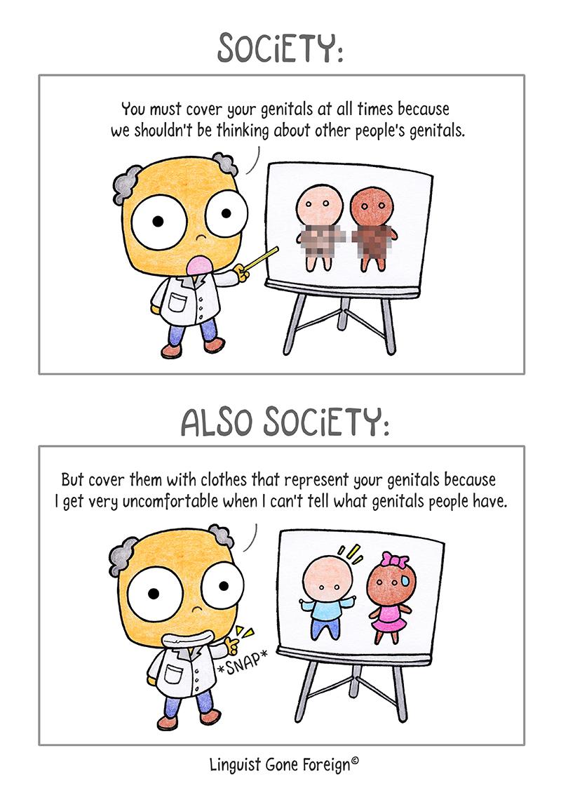 Panel 5: The Rolls-Royce has pulled over. A man with very broad shoulders is leaning over the wall, looking down on the orange car which lies upside down on the stony riverbank below. We can see the driver of the Rolls-Royce, who speaks: "Do be careful, sir!" In the background the tail end of the blue camper van can still be seen, safely on the road and, apparently, none the worse for wear.
