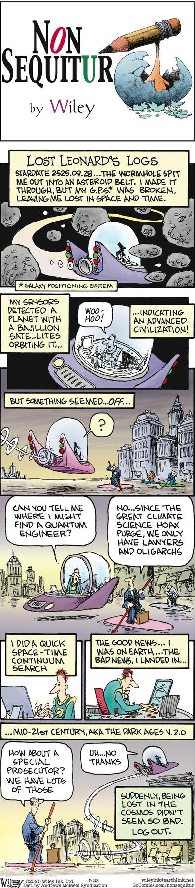 Panel 4: The orange car, swerving, crashes through the dry-stone wall and plunges downwards.