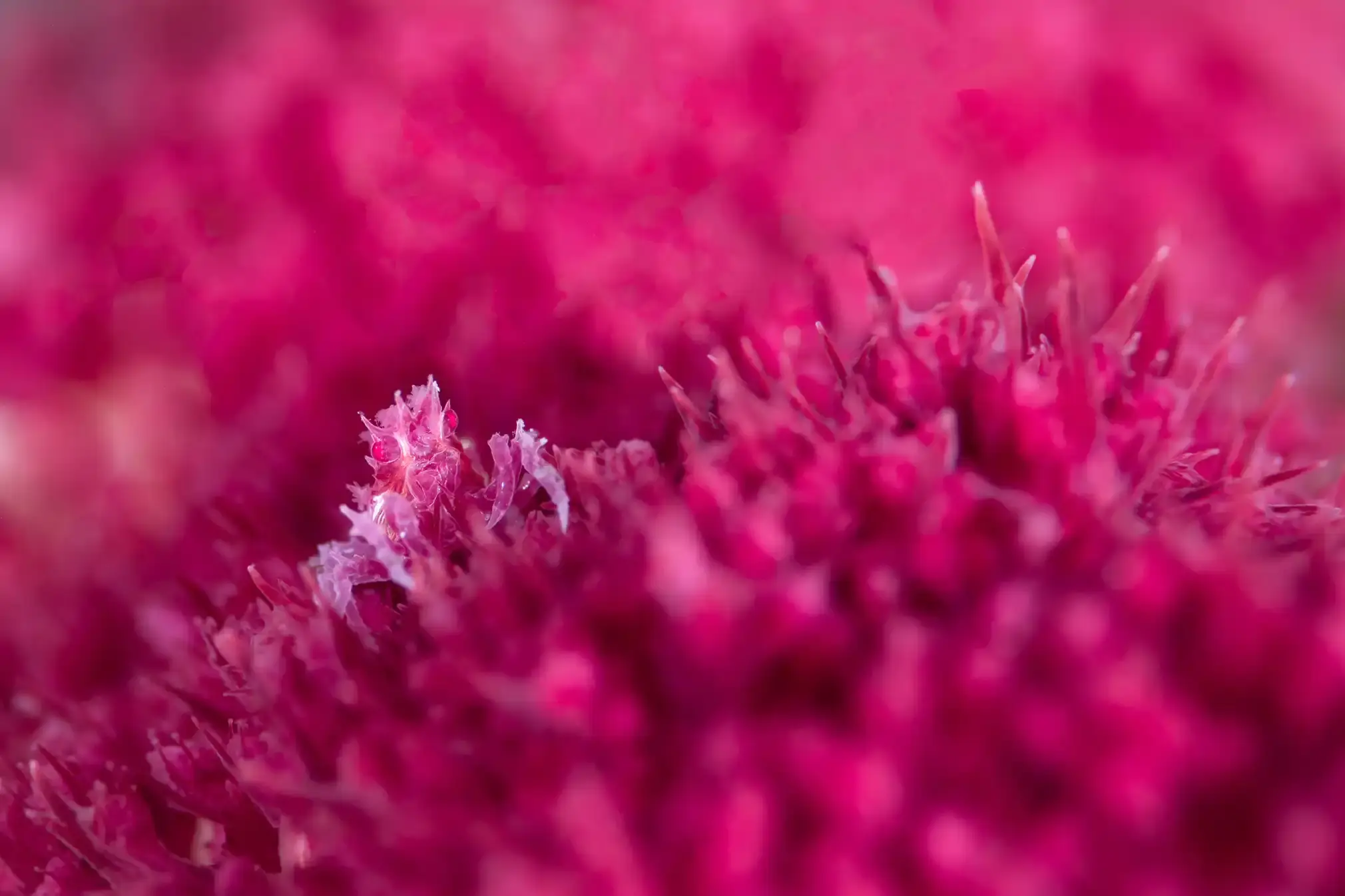 A tiny juvenile candy crab, measuring a mere centimetre in size, perches on a pink coral. “The coral isa lso her favourite source of nutrition,” says Hoksbergen.