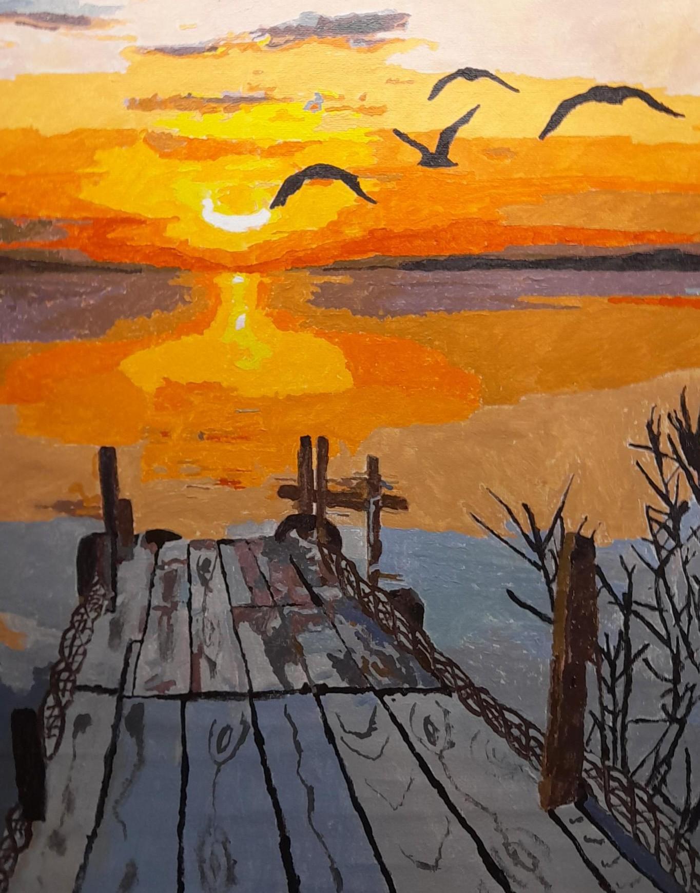 Painting of a sunset on a lake. An old wooden pier with small nsked branches of brush on one side gives way to a glowing orange and yellow lake surface and the sky. Near the top, a group of four large birds is approaching the viewer.