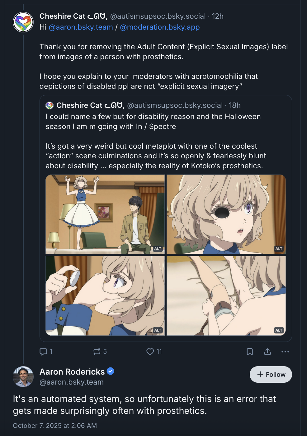 A screenshot of two Bluesky posts. The first shows pictures of an anime character that uses prosthetics. It reads: Hi @aaron.bsky.team / @moderation.bsky.app Thank you for removing the Adult Content (Explicit Sexual Images) label from images of a person with prosthetics. I hope you explain to your moderators with acrotomophilia that depictions of disabled ppl are not “explicit sexual imagery” It has a response from aaron that reads: It's an automated system, so unfortunately this is an error that gets made surprisingly often with prosthetics.