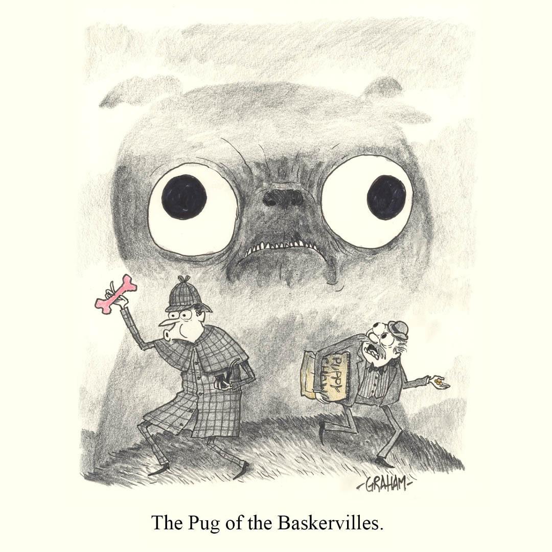 A cartoon illustration of Shelock Holmes and Watson being surprised by a giant pug in the fog. Caption reads "The Pug of the Baskervilles."