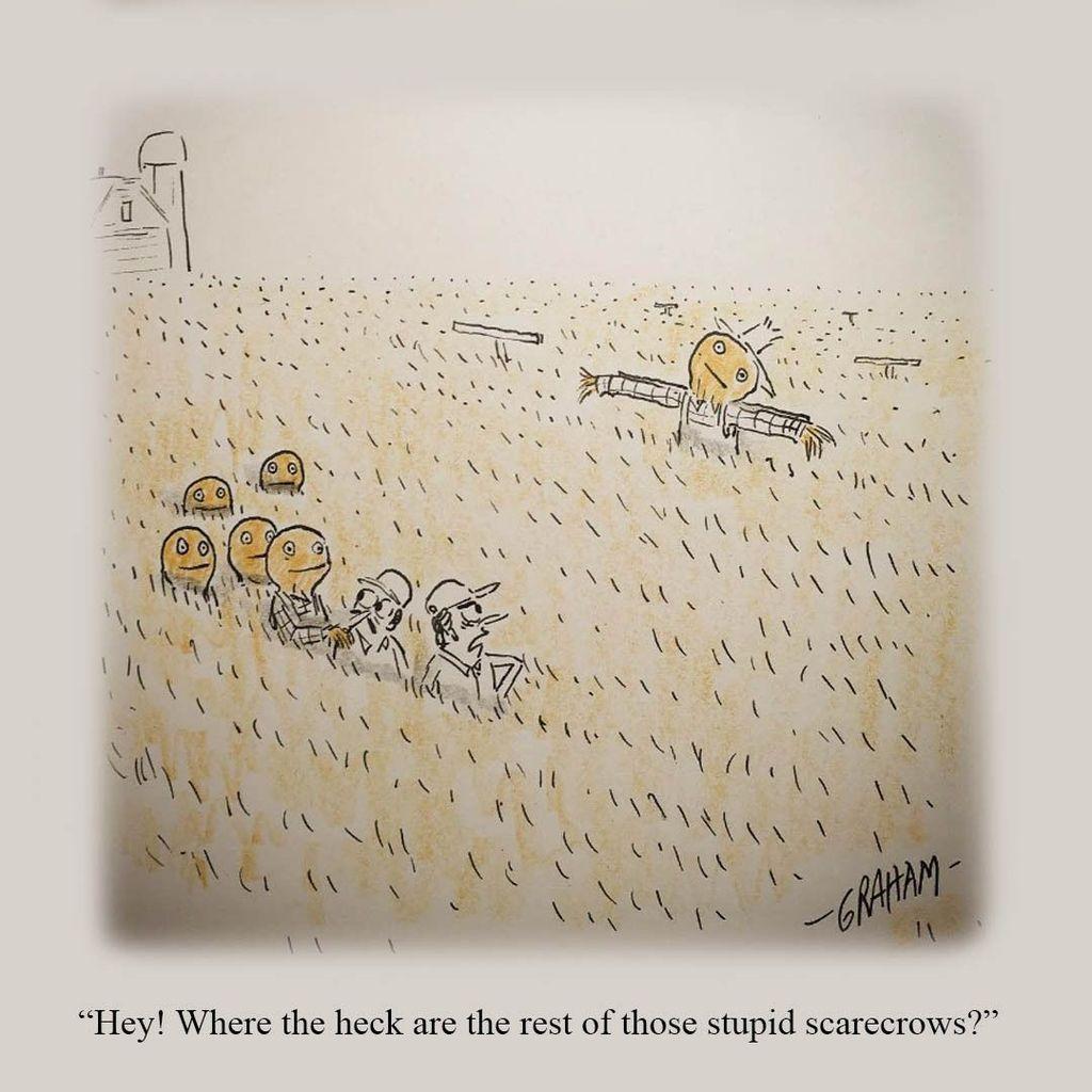 A cartoon illustration of one farmer looking and talking at a single scarecrow as the other farmer notices the scarecrows walking behind them in the corn field. Caption reads "Hey! Where the heck are the rest of those stupid scarecrows?"