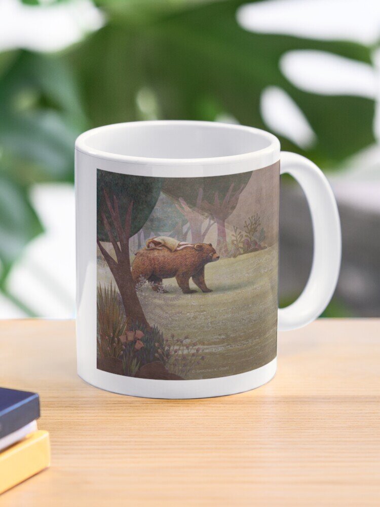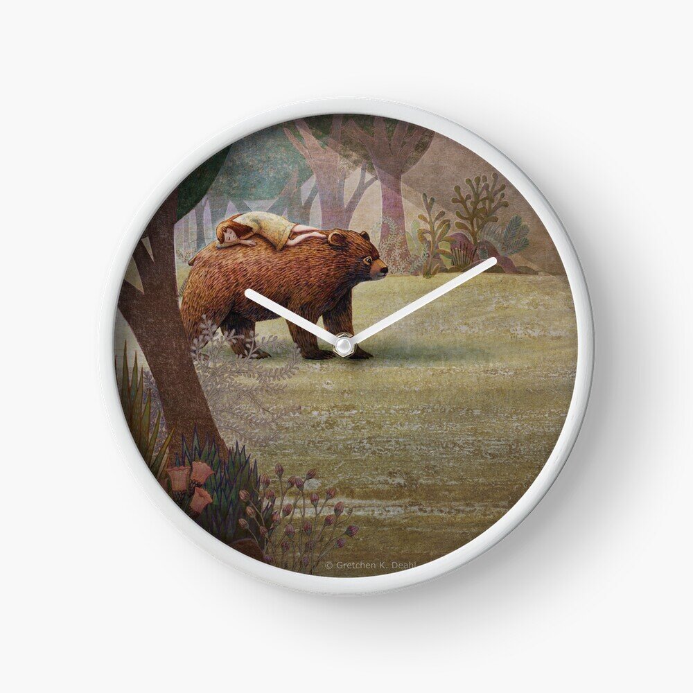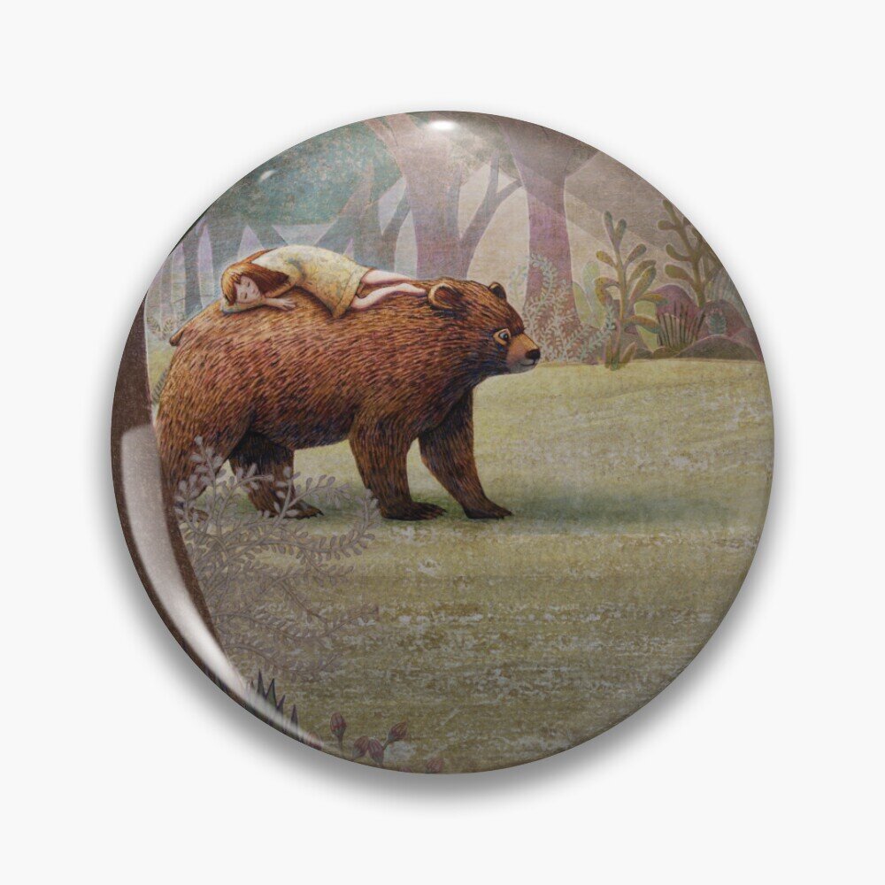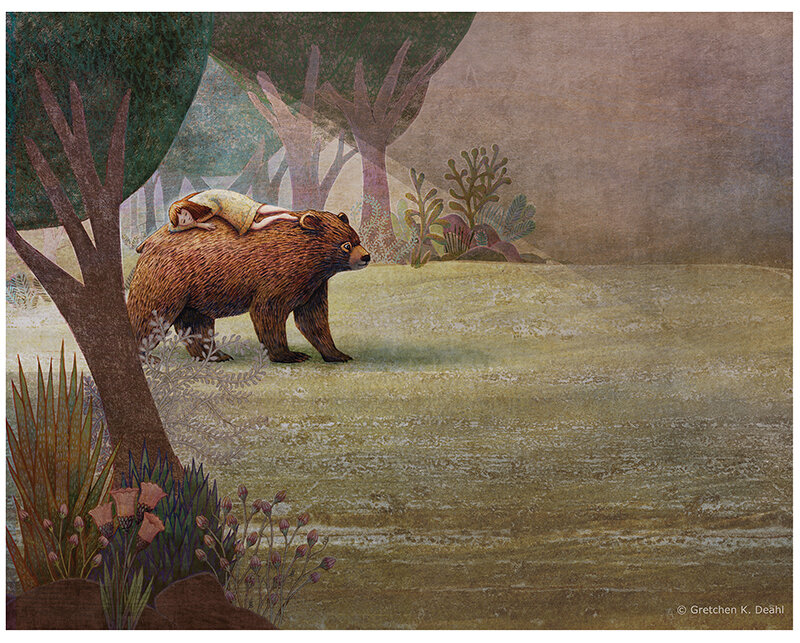 In the quiet forest, walks a gentle bear. Upon his sunny back a young girl sleeps.