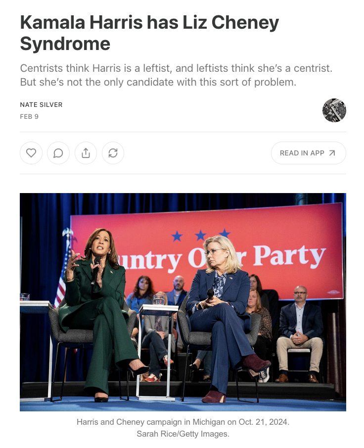 If Nate Silver (hardly a leftist) tells you that you are too far to the right to be recognisably a Democrat hanging out with Liz Cheney, then maybe you have a far right problem.
