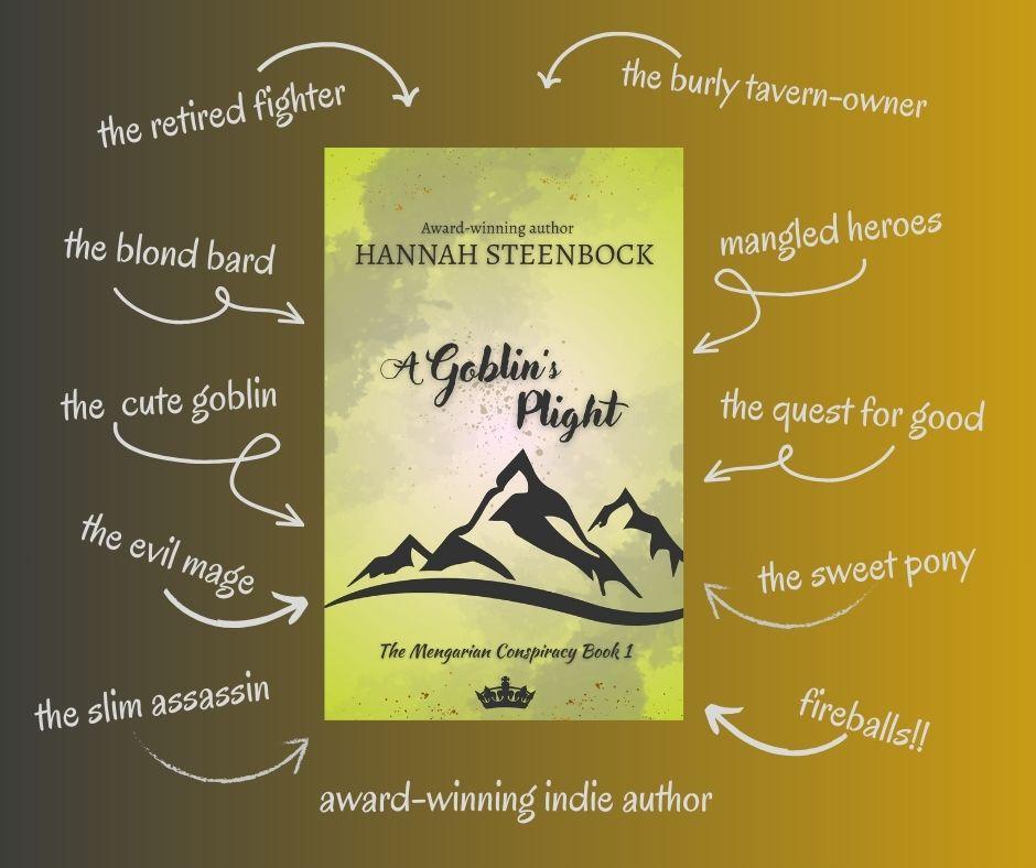 Trope Matrix for A Goblin’s Plight by Hannah Steenbock On a background with a brown-golden gradient, the book’s cover sits in the center, surrounded by a list of tropes and arrows pointing from them to the cover. The cover has a mottled background in green, with a stylized mountain drawing in the center. The title is spread over two lines just above the mountain’s peak. The author name sits below the mountain. Below that, the series name is The Mengarian Conspiracy, with a black crown in decoration at the very bottom of the cover. The tropes listed are, from top to bottom: the retired fighter, the burly tavern-owner, the blond bard, mangled heroes, the cute goblin, the quest for good, the evil mage, the sweet pony, the slim assassin, fireballs!!, and award-winning indie author.