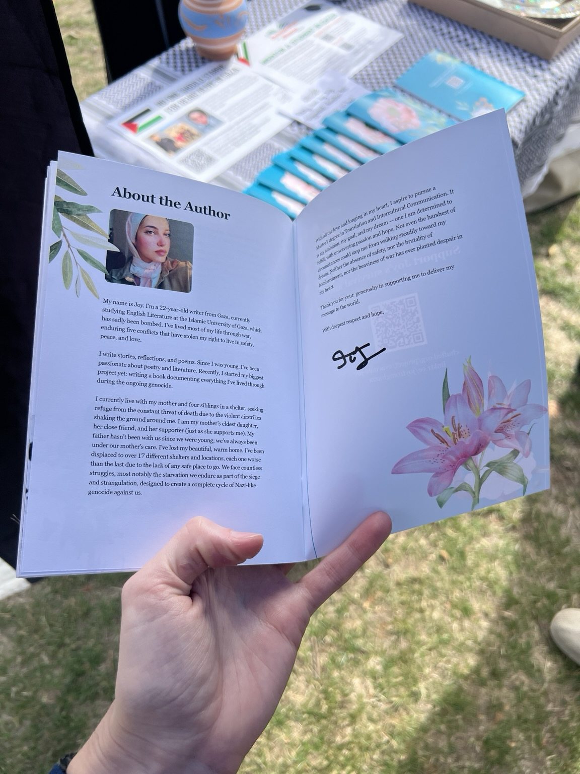 If you’d like to do the same, you can download her book as a PDF and take it to your local print shop or FedEx (be aware local printers will likely be much cheaper than FedEx). Find it here: https://linktr.ee/joyfromghazza