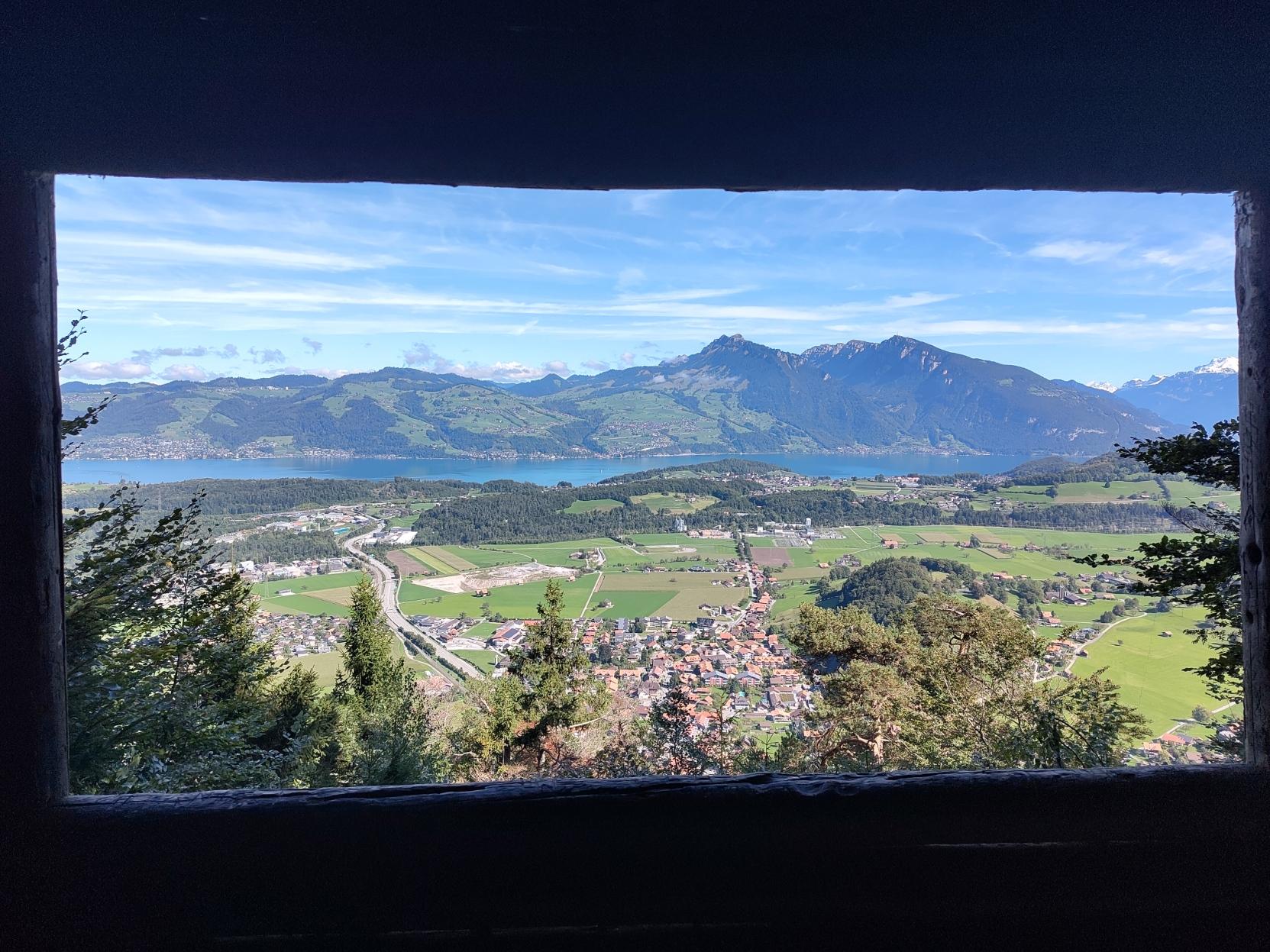 View from a window in a lookout hut over mountains landscape and Lake Thun