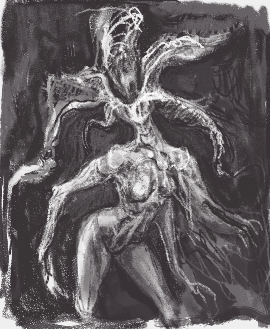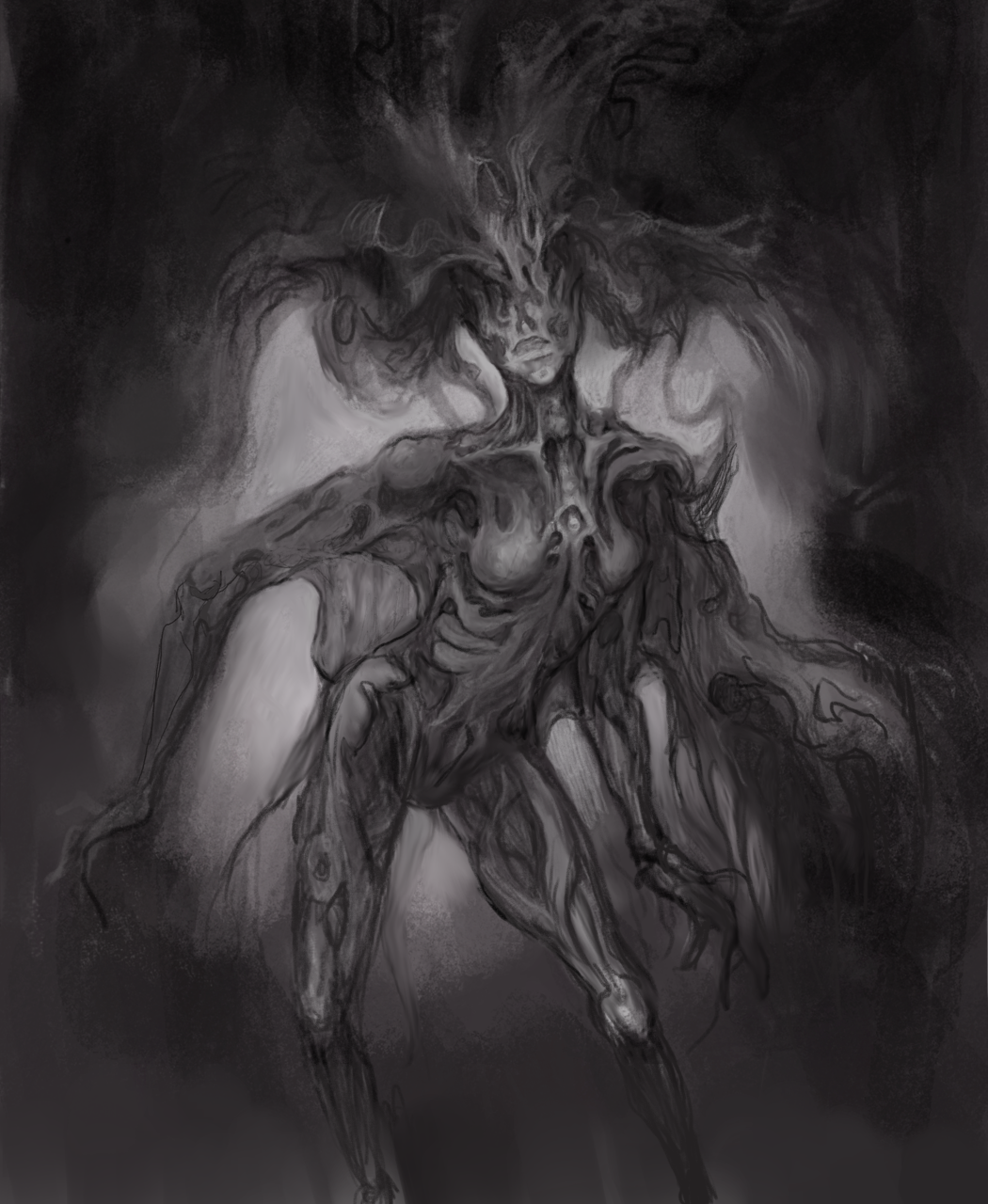 Here are some process shots from the same digital painting. That creepy carapace in the first sketch that didn't carry through to the later versions.