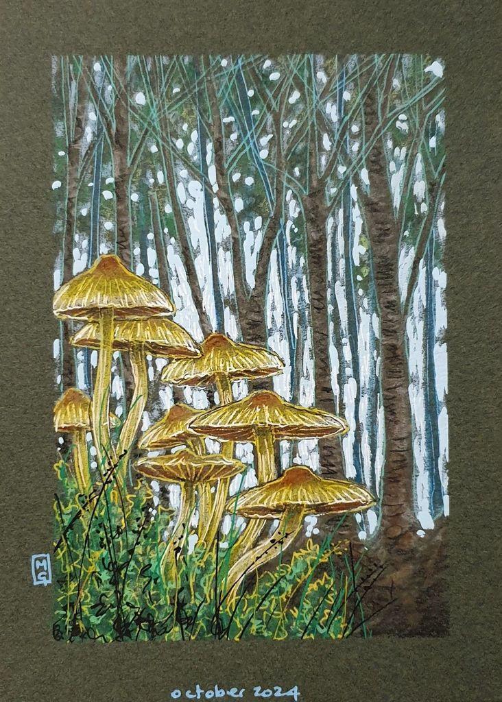Unidentified brown, glossy mushrooms at base of tree trunk & artist conks are growing on the tree, much higher up.