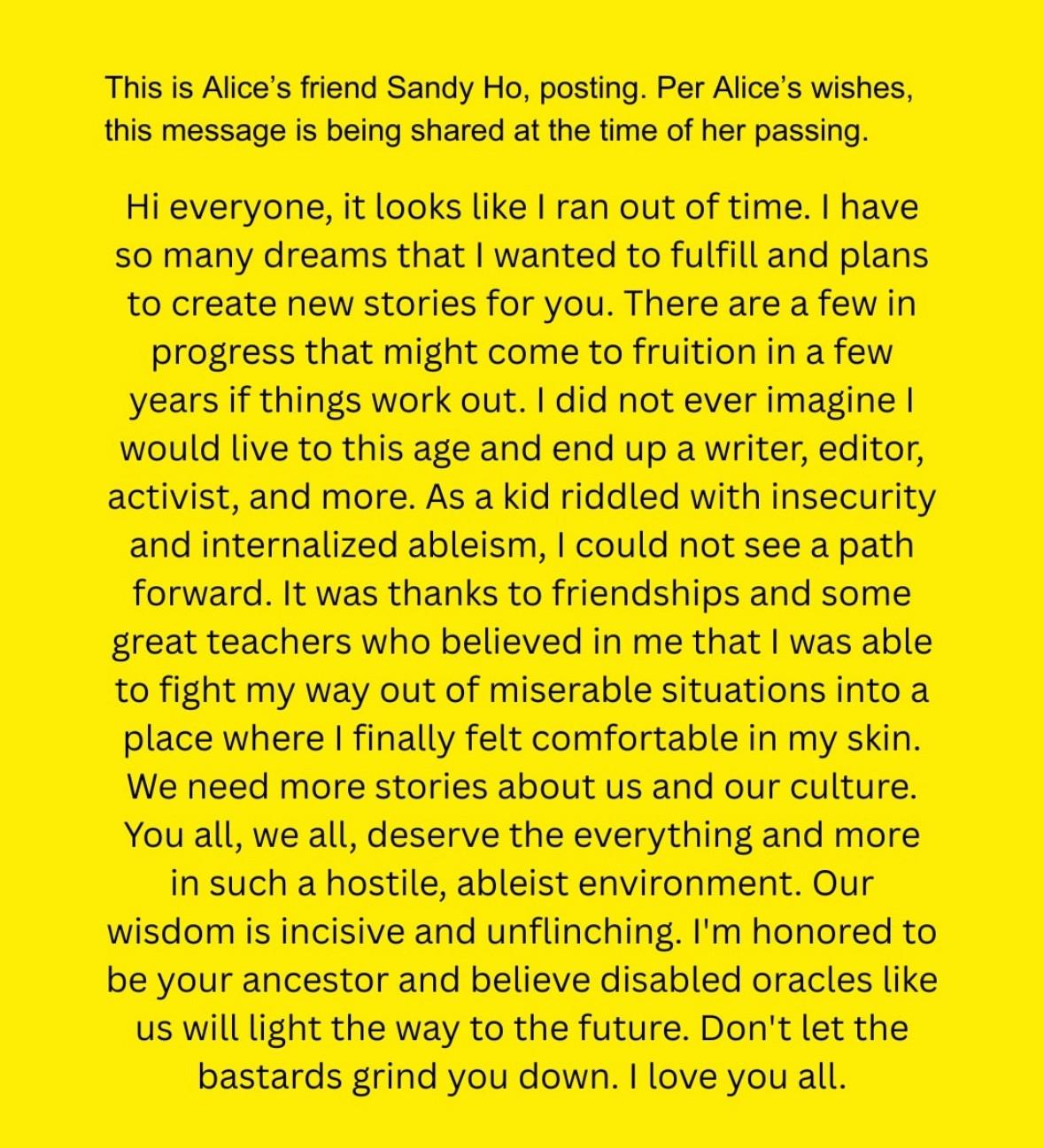 Oh my stars, we've lost a legend. Rest in power, Alice Wong.