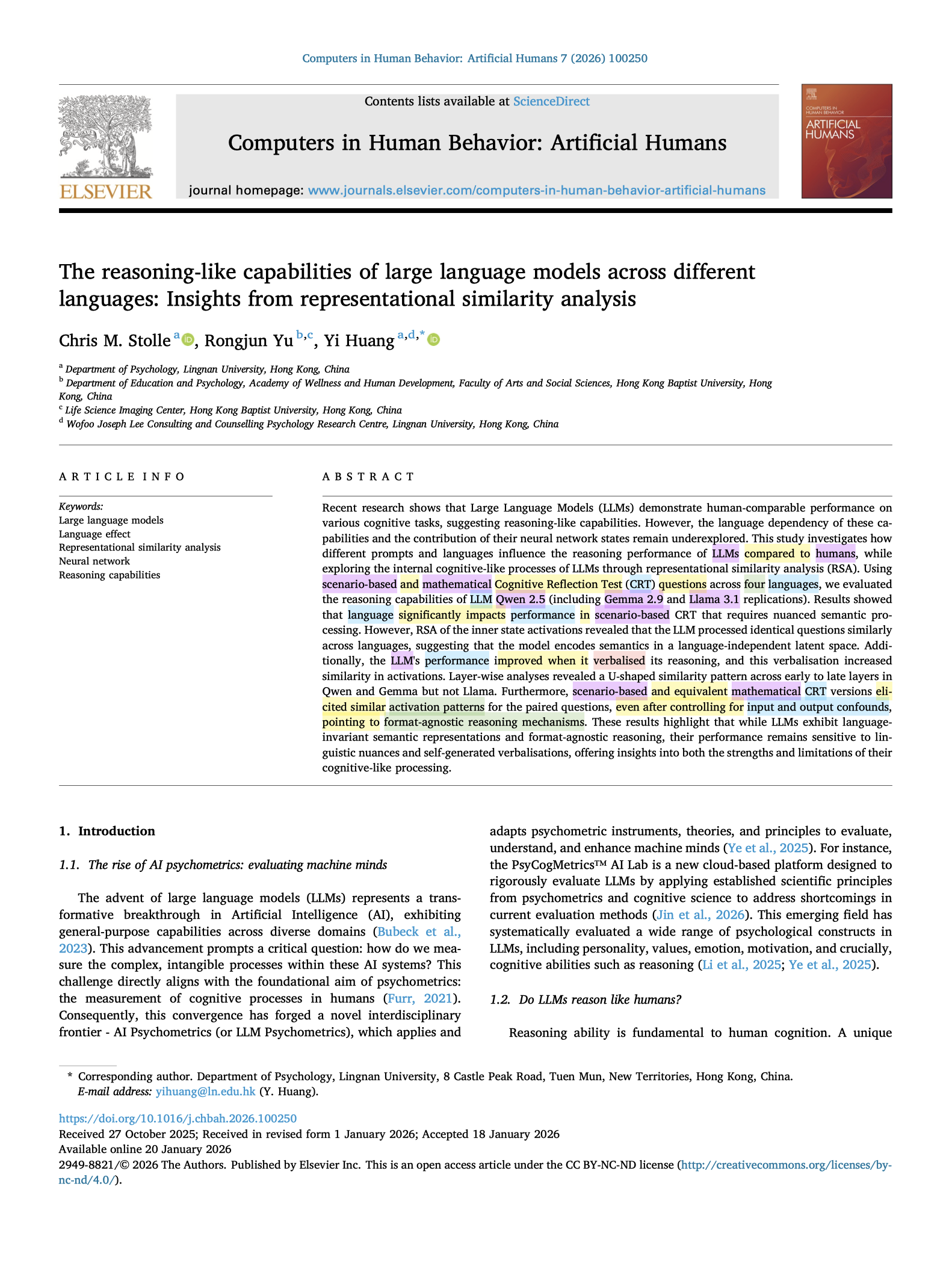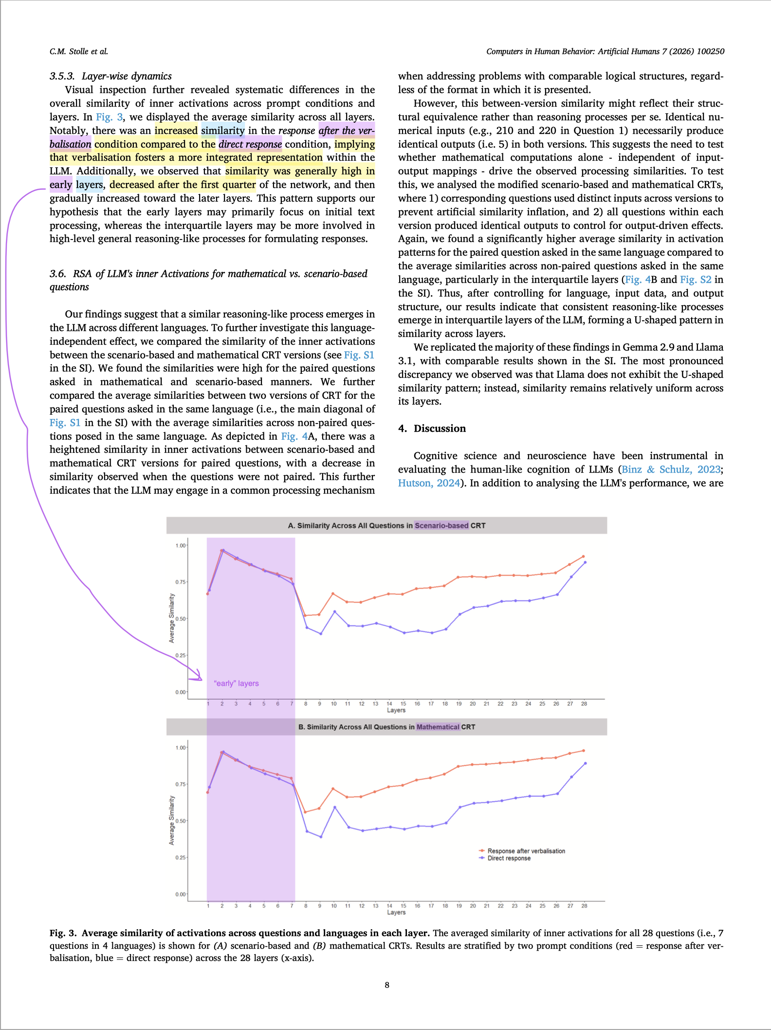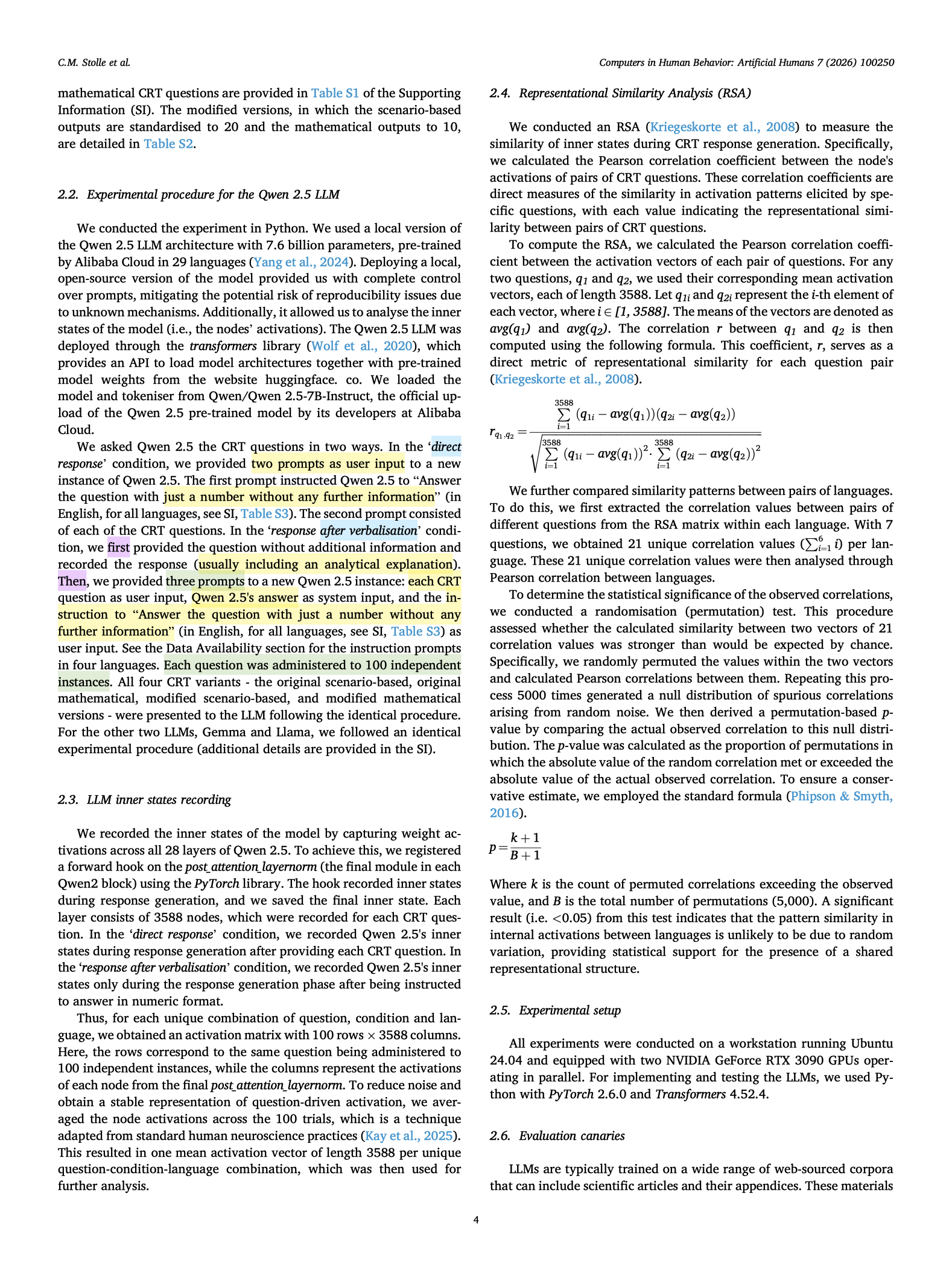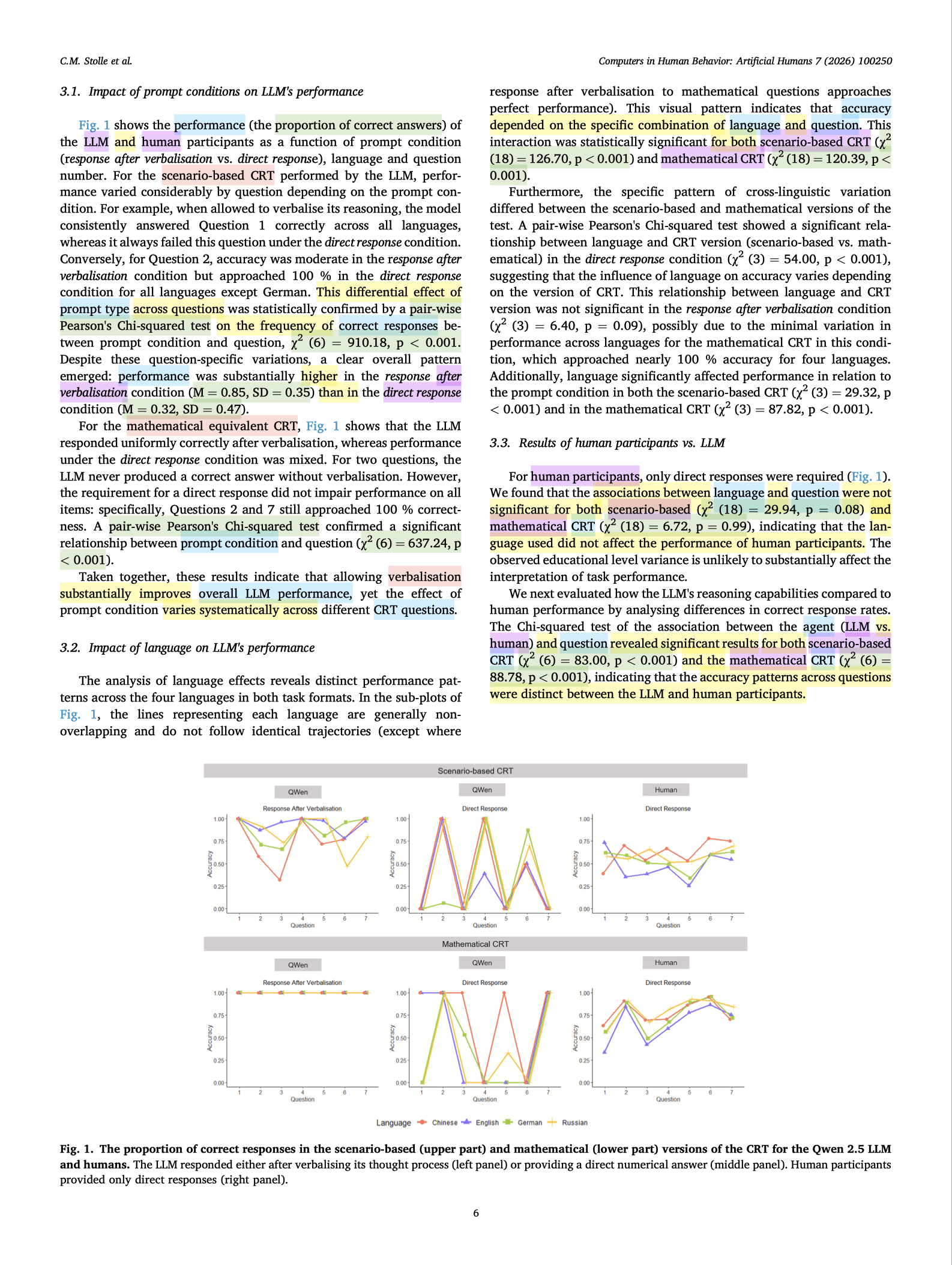 "We asked Qwen 2.5 the CRT questions in two ways. In the ‘direct response’ condition, we provided two prompts as user input to a new instance of Qwen 2.5. The first prompt instructed Qwen 2.5 to “Answer the question with just a number without any further information” (in English, for all languages, see SI, Table S3). The second prompt consisted of each of the CRT questions. In the ‘response after verbalisation’ condition, we first provided the question without additional information and recorded the response (usually including an analytical explanation). Then, we provided three prompts to a new Qwen 2.5 instance: each CRT question as user input, Qwen 2.5's answer as system input, and the instruction to “Answer the question with just a number without any further information” (in English, for all languages, see SI, Table S3) as user input. See the Data Availability section for the instruction prompts in four languages. Each question was administered to 100 independent instances."