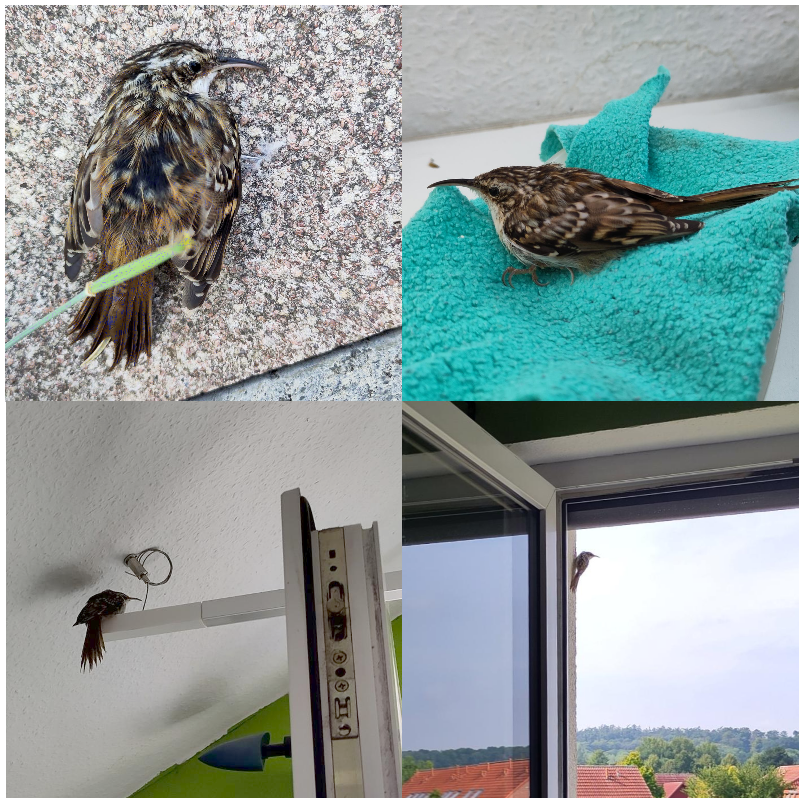 Ich möchte euch Günni vorstellen, Günni den Gartenbaumläufer. Nach einer Kollision mit der verglasten Terrassentür lag er benommen auf der Terrasse, und ich habe ihn reingenommen, damit ihn die Katze nicht holt. Nach und nach hat er sich berappelt und dann den Weg nach draußen gefunden.