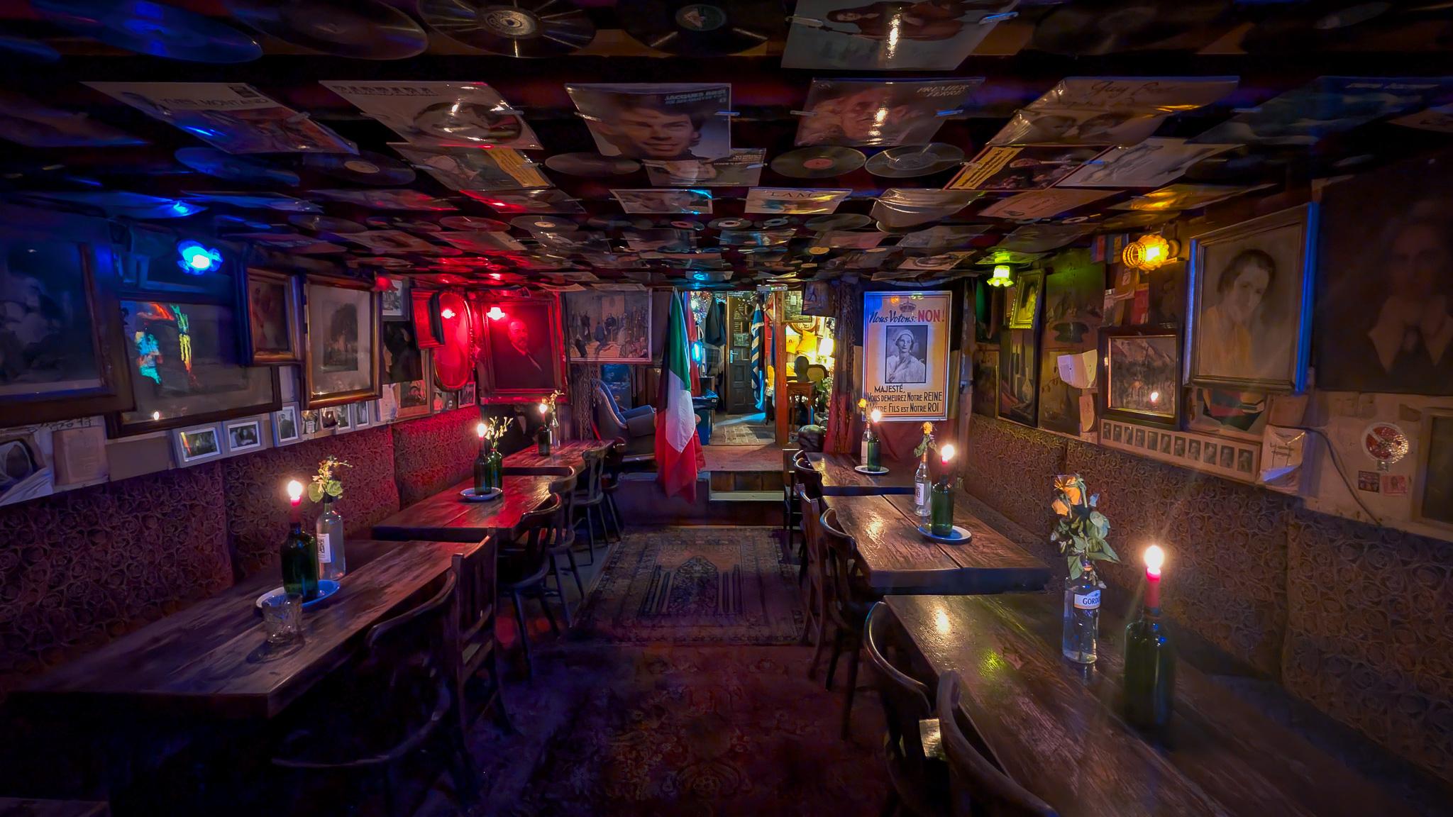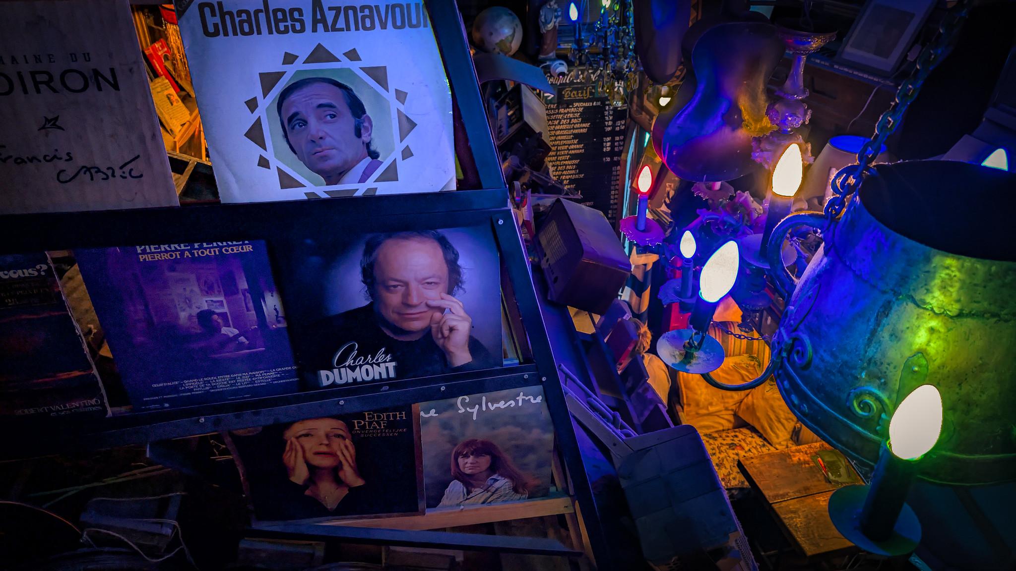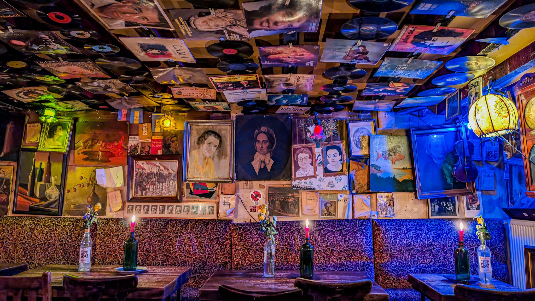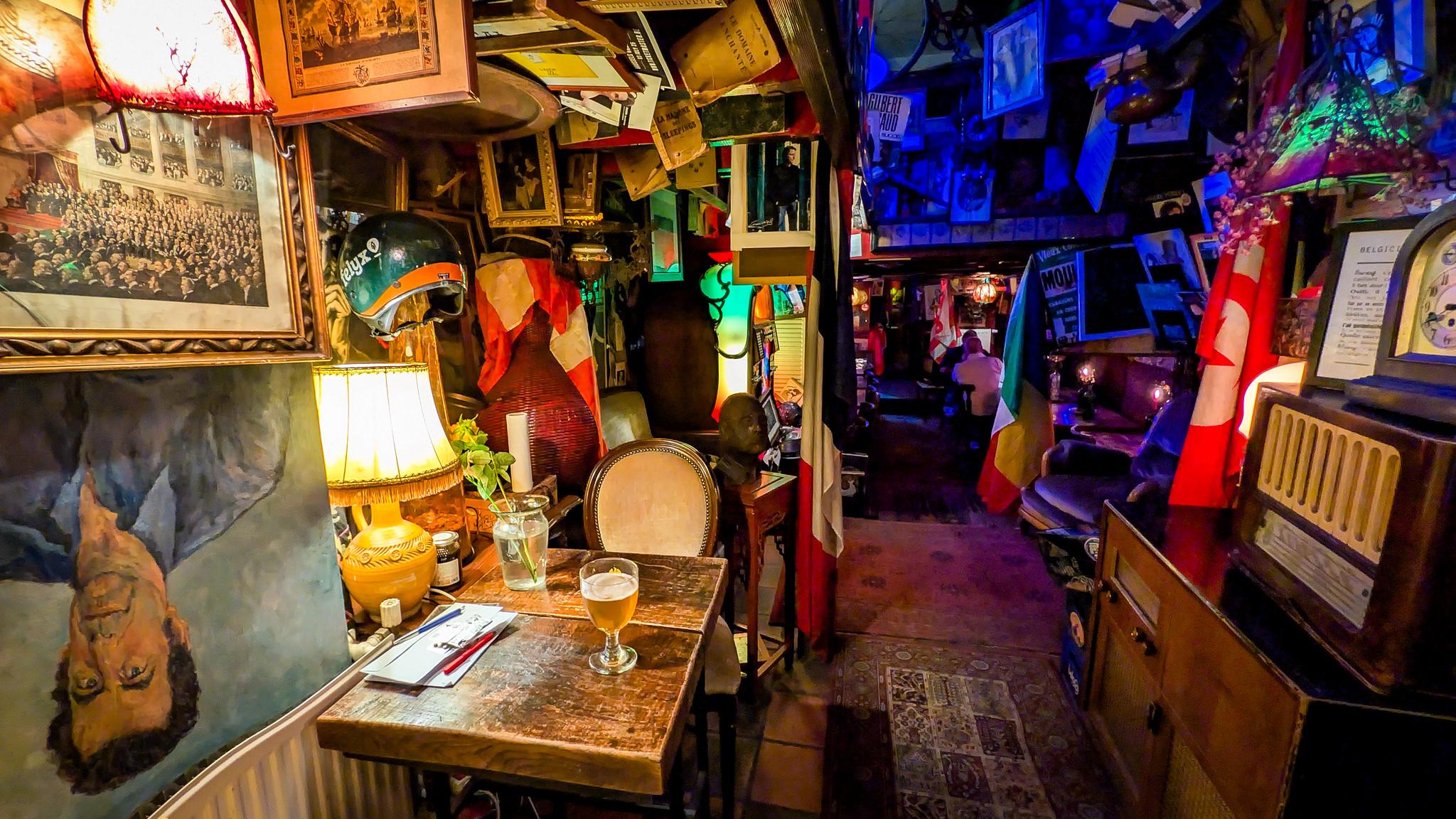 If you're ever in Brussels, just a few steps from the Grand‑Place you'll find Goupil Le Fol tucked away on Rue de la Violette, half bar, half cabinet of curiosities. Old chansons on the speakers, red candles in wine bottles, and walls drowning in portraits, sheet music and odd relics, like drinking in a fever dream mix of Parisian and Brussels nostalgia.