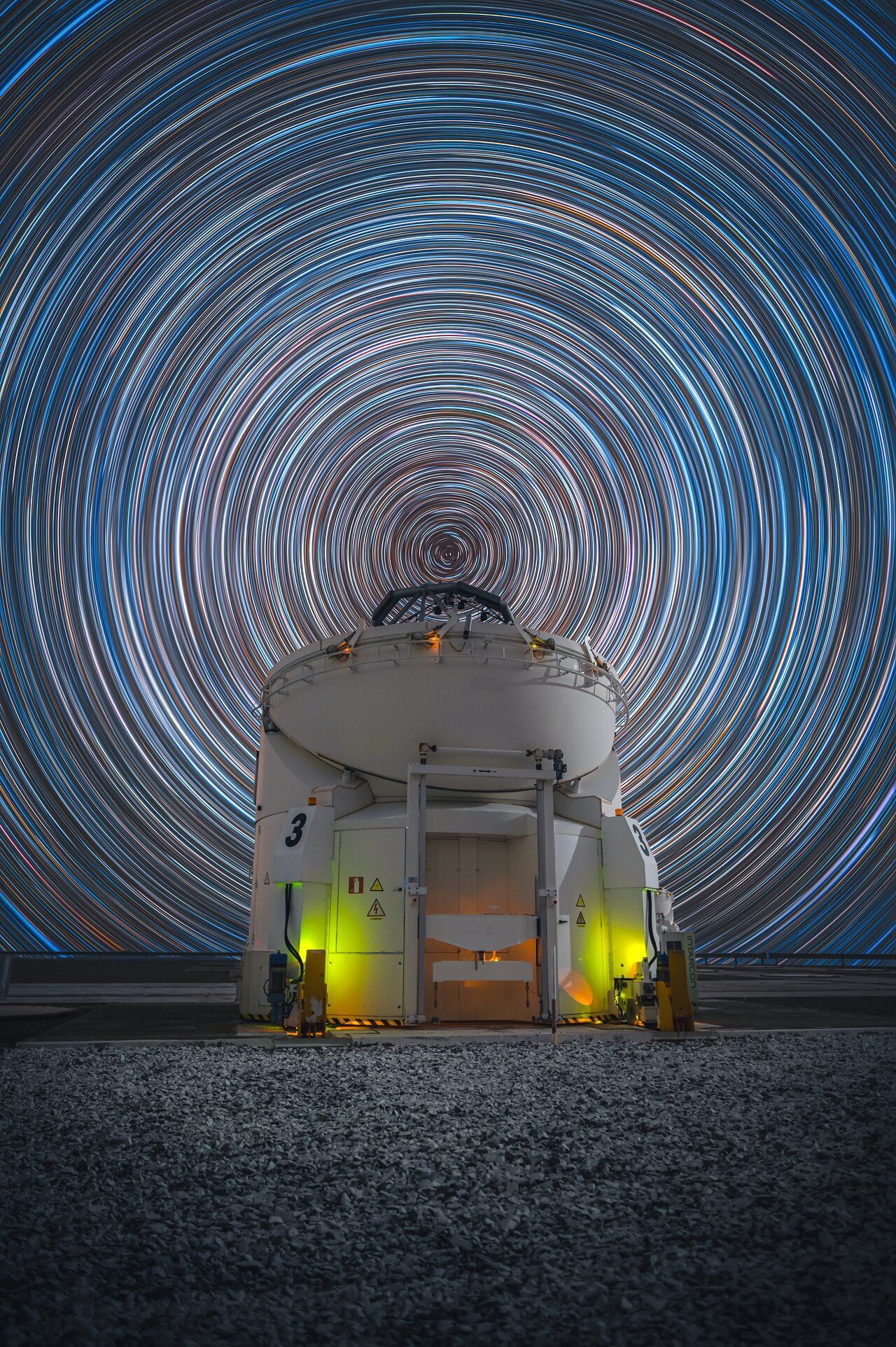 Yet the sky is not revolving around the tip of one of our Auxiliary Telescopes. This illusion is caused by the almost perfect alignment with the southern celestial pole, around which stars seem to trail due to Earth's rotation.