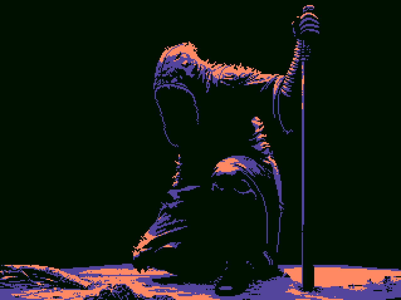 Pixel art of a landscape sculpted from fractured memory, where a stone pathway, a grey river of time, cleaves directly into the heart of a crystalline wilderness. Jagged formations, like frozen lightning strikes, rise in a dense chorus of dark blues and grays, their sharp angles mirroring a forgotten architecture. The ground breathes between them, a shadowed earth from which these mineral spires bloom. A slow climb ascends to a plateau crowned by arching structures, twin gates framing a distant water’s embrace, a liquid mirror reflecting a sky ablaze with sunset’s molten hues. A lone figure, a punctuation mark on the winding route, faces the horizon where the sun, a gilded coin, hovers above a boundless expanse. Scattered like fallen stars, tiny yellow lights shimmer across the scene, a constellation born of stone and sky, while long shadows stretch like fingers across the fractured ground, tracing the path’s relentless journey toward an unseen destination.