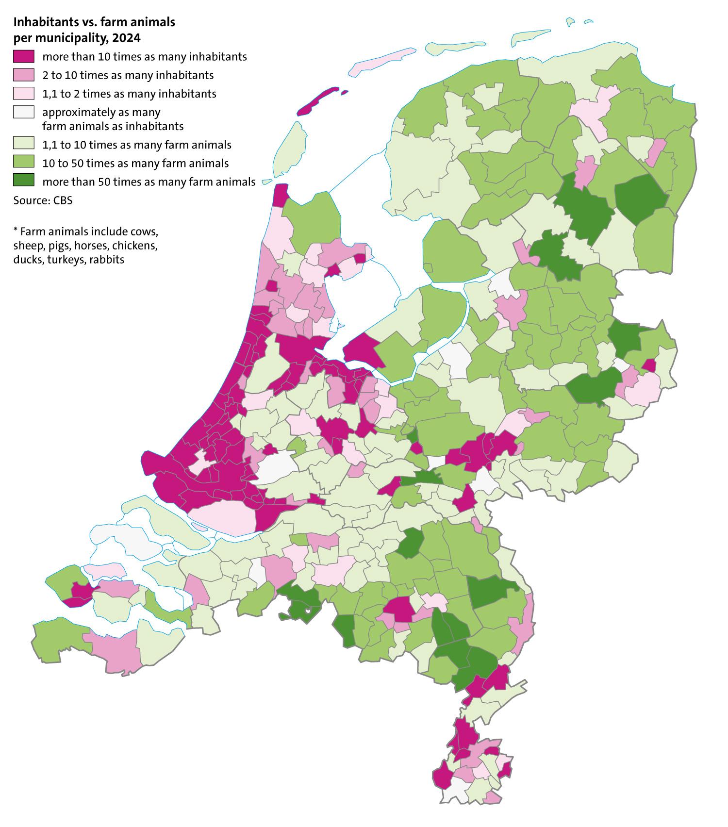Map of the ratio between the total number of farm animals and the number of inhabitants per municipality in the Netherlands based on data of Statistics Netherlands (CBS).