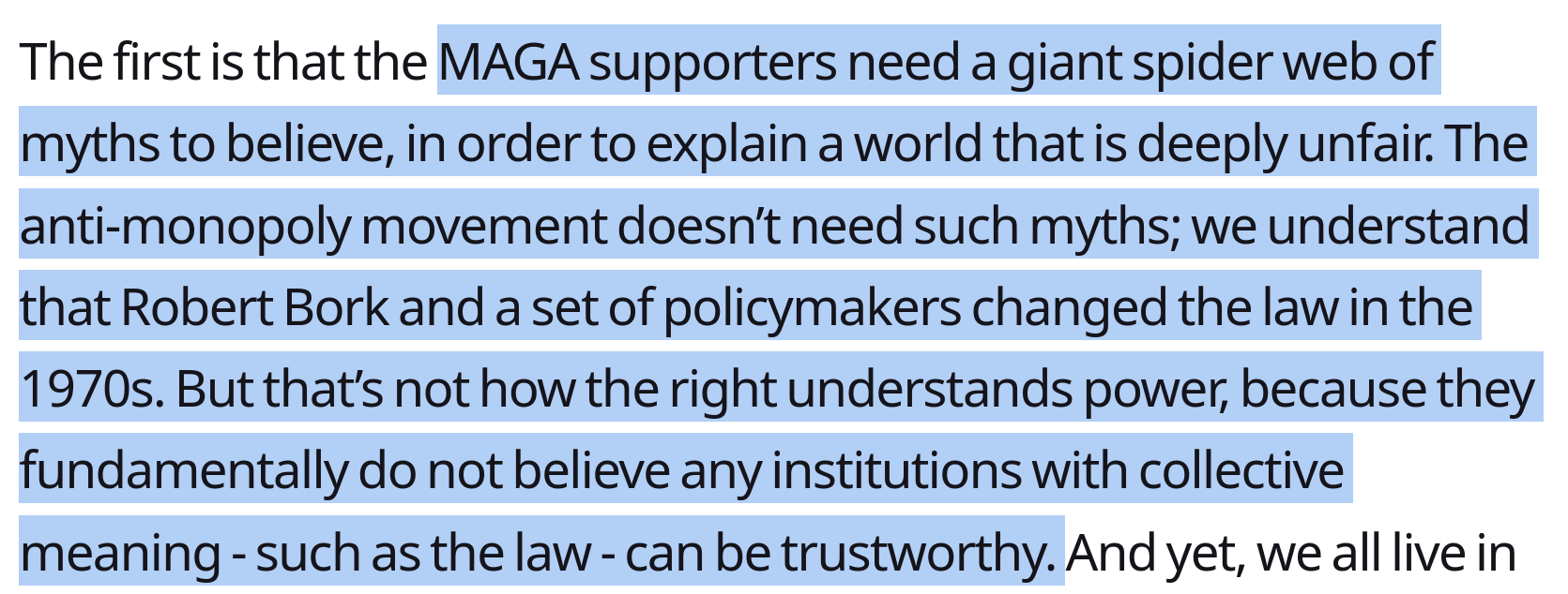 MAGA supporters need a giant spider web of myths to believe, in order to explain a world that is deeply unfair. The anti-monopoly movement doesn’t need such myths; we understand that Robert Bork and a set of policymakers changed the law in the 1970s. But that’s not how the right understands power, because they fundamentally do not believe any institutions with collective meaning - such as the law - can be trustworthy.