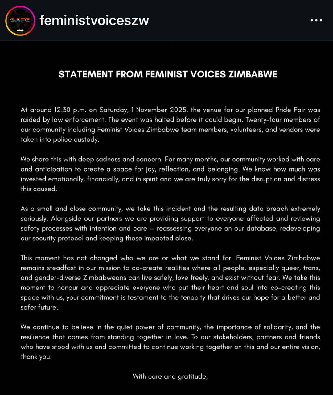 "At around 12:30pm on Saturday, 1 November 2025, the venue for our planned Pride Fair was raided by law enforcement. The event was halted before it could begin. Twenty-four members of our community including Feminist Voices team members, volunteers, and vendors were taken into police custody.
