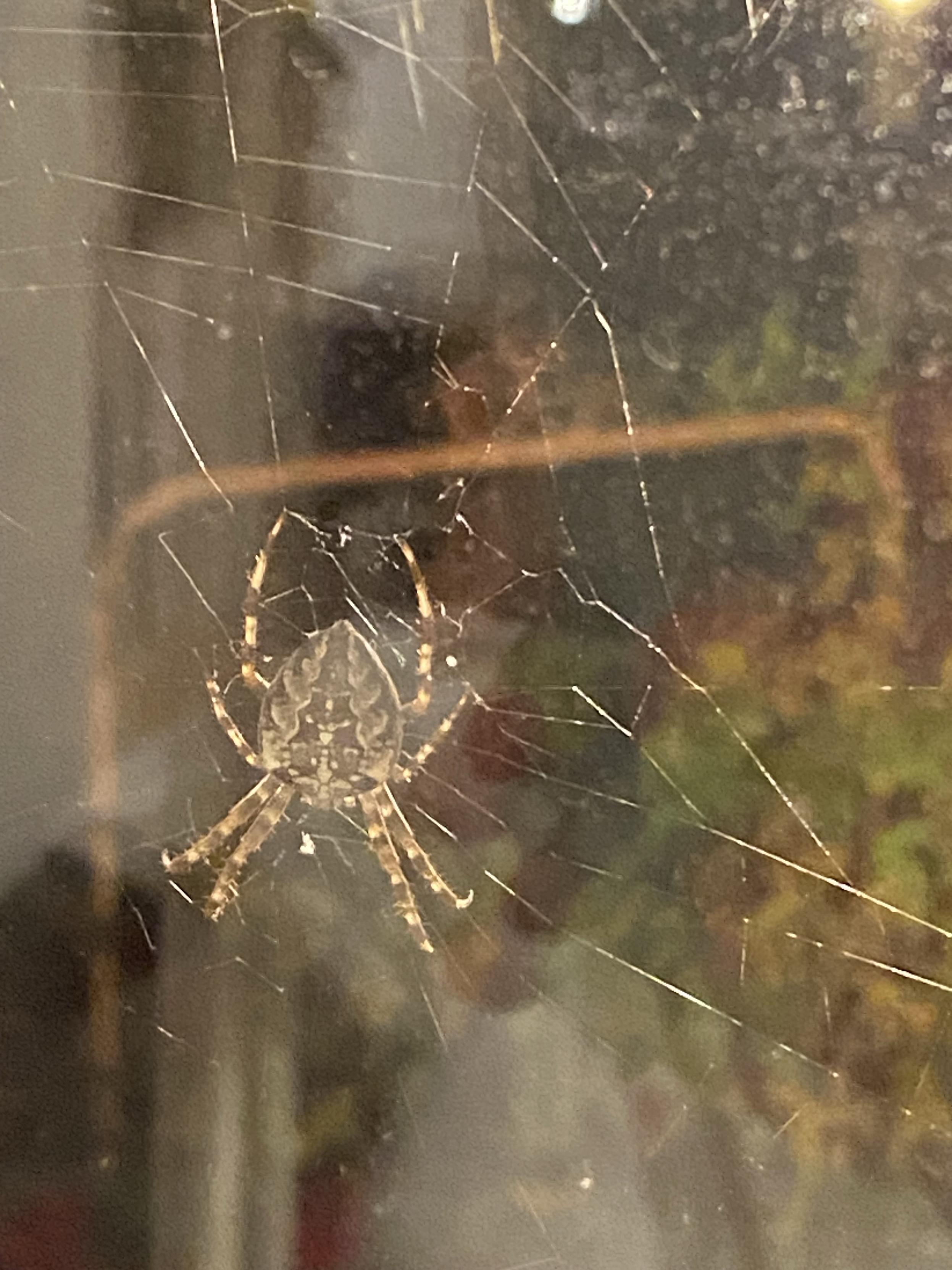 The biggest and most prosperous late November orb weaver in memory, seen from inside the window. (It hangs out under the eaves.) #Fensterfreitag