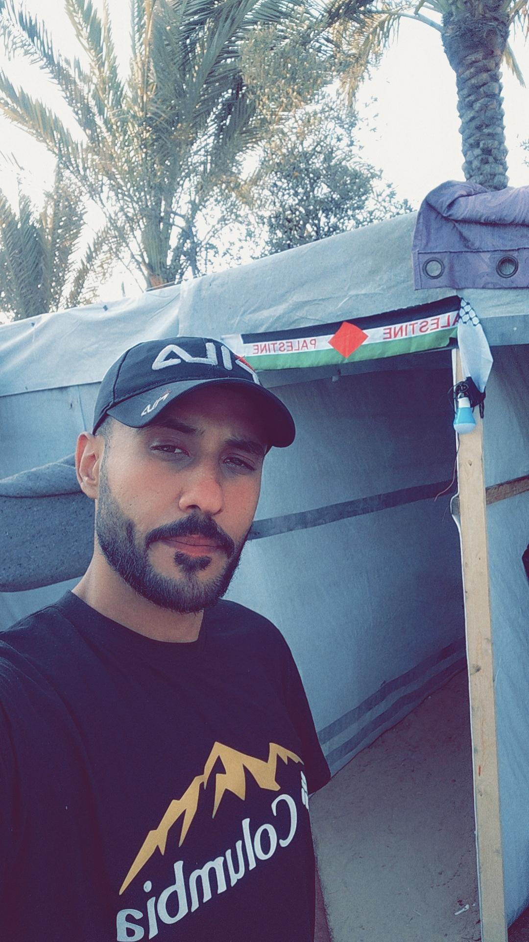 Mustapha en pied face camera à la proue du voilier tend entre ses mains le drapeau de la Palestine aec ecrit EUROPALESTINE sur la bande blanche : "Bonjour Je m'appelle Mustapha, je suis Medic à bord du bateau Anas El Sharif et je suis fier de représenter l’association Europalestine pour tenter d'aller briser le blocus illégal israelien dans la bande de Gaza"