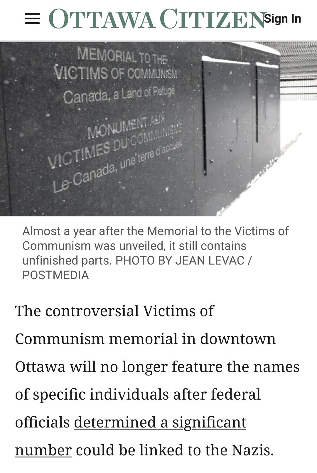 La ville Ottawa qui voulait un "mémorial aux victimes du communisme" [sic] se retrouve bien emmerdée avec plus de la moitié des 553 noms qui devaient être inscrits qui s'avèrent avoir des liens avec les nazis. Finalement, ils vont plus mettre de noms du tout, hein ... Oupsiiii ...