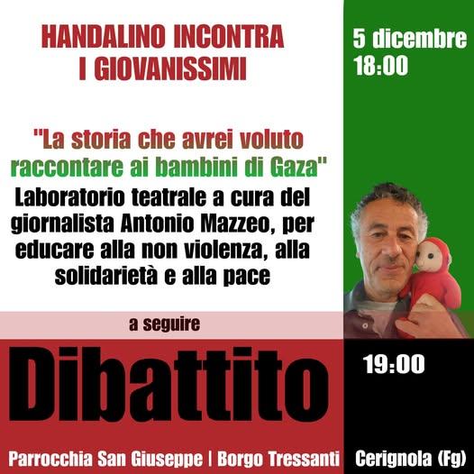 #stopthegenocideingaza🇵🇸 Handalino, Coniglio Clown e il Vecchio Marinaio solcano lo Stretto e debuttano nel Continente. Venerdì 5 dicembre alle ore 18 a Borgo Tressanti #Cerignola ( #Foggia) in "La fiaba che avrei voluto raccontare ai bimbi di #Gaza".