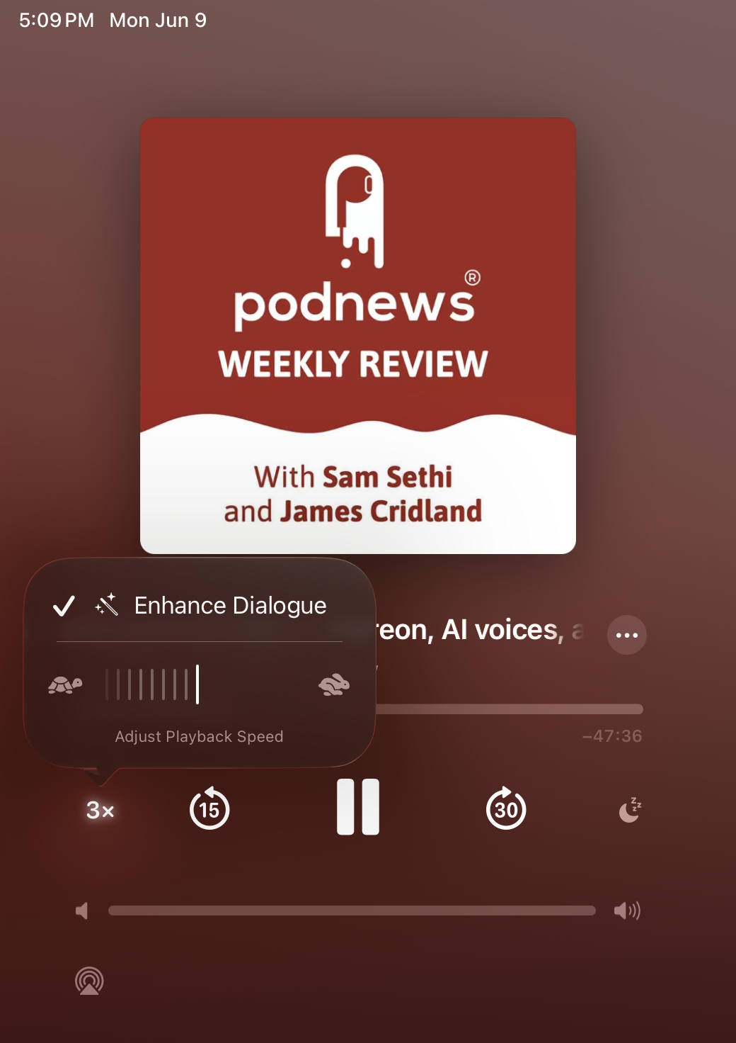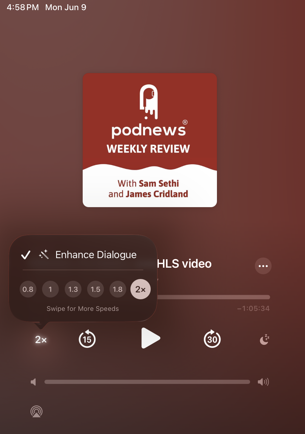 and here are where "Enhance Dialogue" and speed settings live in Apple Podcasts