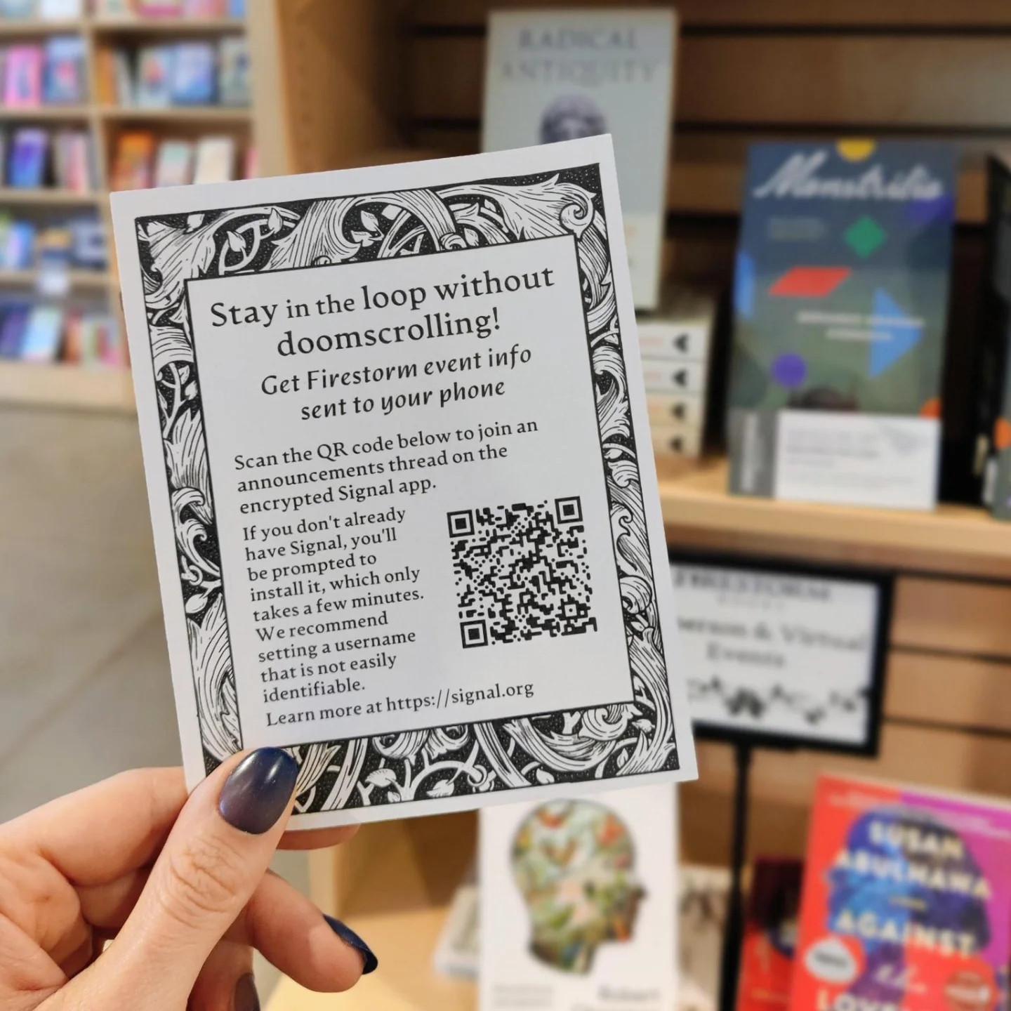 Follow us to a place without data harvesting, shadow bans, and right wing trolls. This week we're launching a new broadcast thread on the Signal app, specifically for events at Firestorm. Sign up and you'll get event announcements + a weekly roundup reminder (no memes, no side chatter—strictly event details!).
