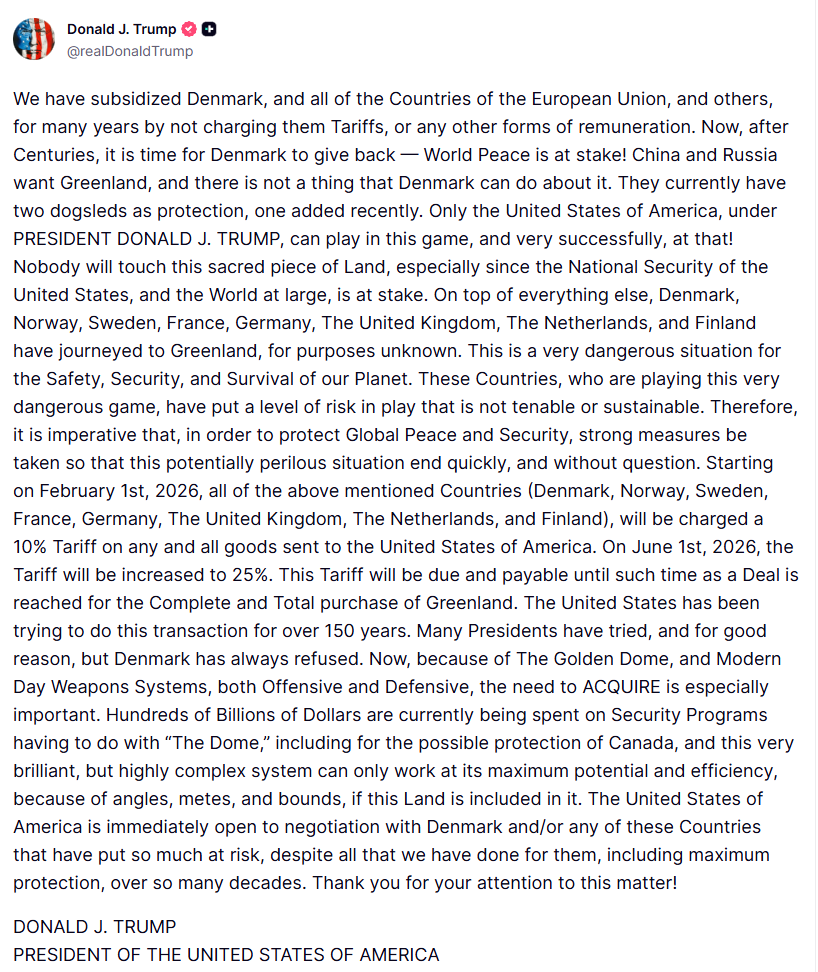 Hope you can read this, #Trump's post threatening the UK and European nations with #tariffs if they don't agree to back off and give him #Greenland. This is going to get nasty.