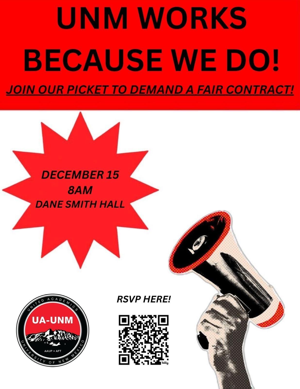 30 second video clip of dozens of people at a rally to support the United Academics of UNM union. They are holding signs that say union strong, union busting is disgusting, and give us a fair contract. There is a person in the background on a bullhorn leading them in chants, including when i say union, you say power, our union united will never be divided, and if we don't get it shut it down.