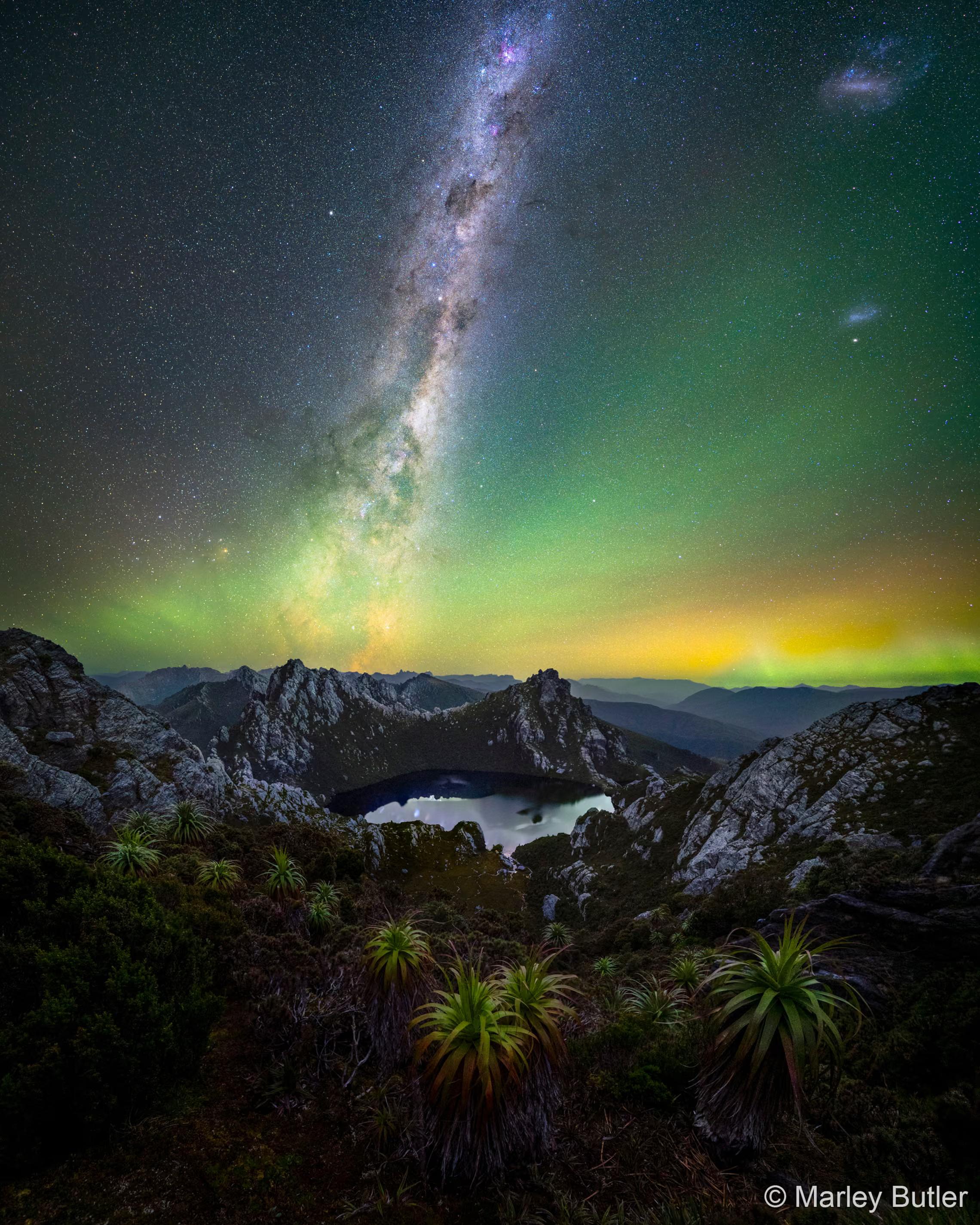 ‘An amphitheatre of pandani watch on as the galactic core, swathed in airglow, rises over an alpine lake, nestled in a rugged Tassie mountain range. Lady Aurora dances under the Magellanic Clouds. This image was captured on a crisp night in one of Tasmania’s more rugged and majestic multi-day walks.’ Loinnekumme country, South-west national park, Tasmania.